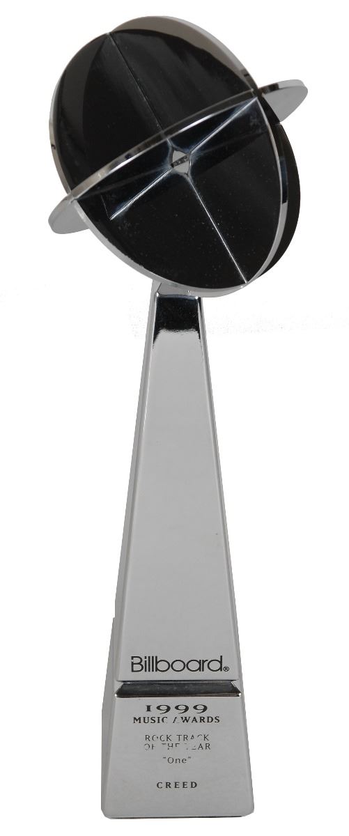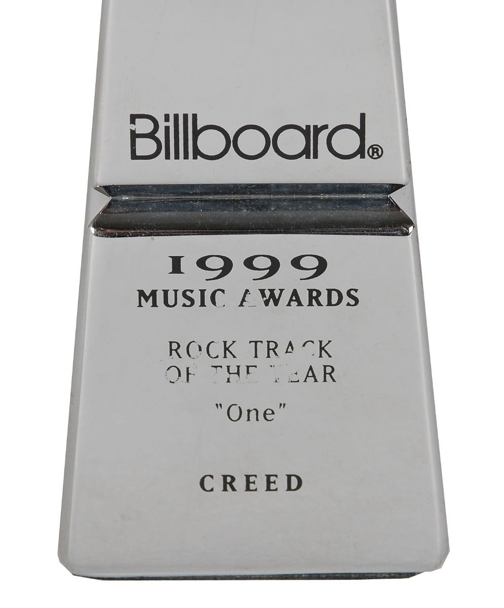 Official Billboard Music Award awarded to Creed for best rock track in 1999, measuring 13.25? tall and weighing 5 pounds, with black text reading: “Billboard 1999 Music Awards, Rock Track of the Year, ‘One,’ Creed.” In fine condition, with some wear to the text.