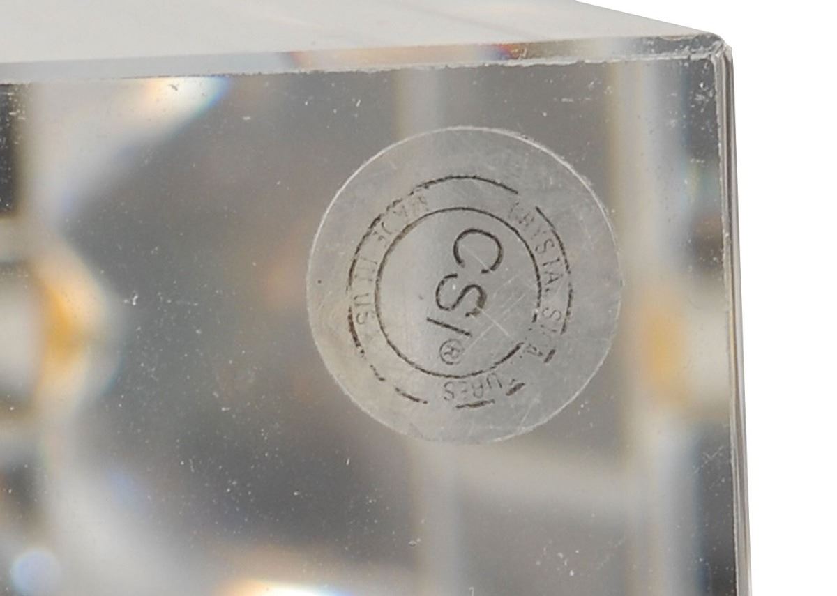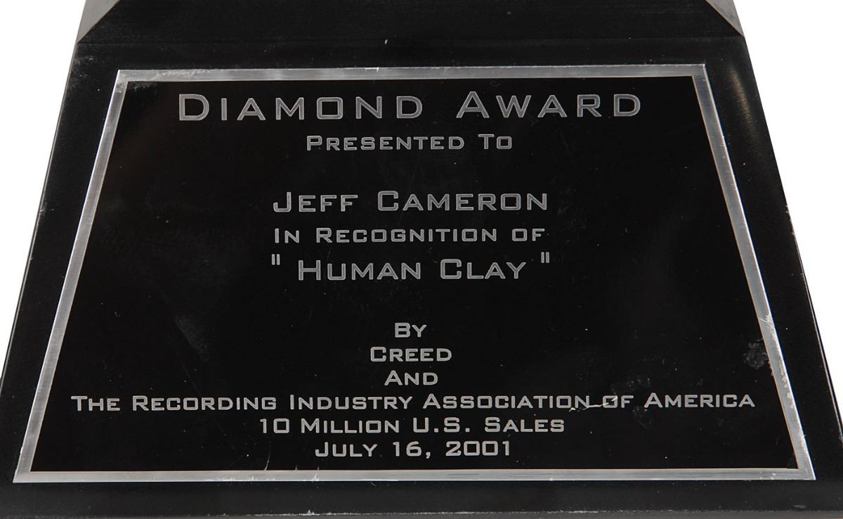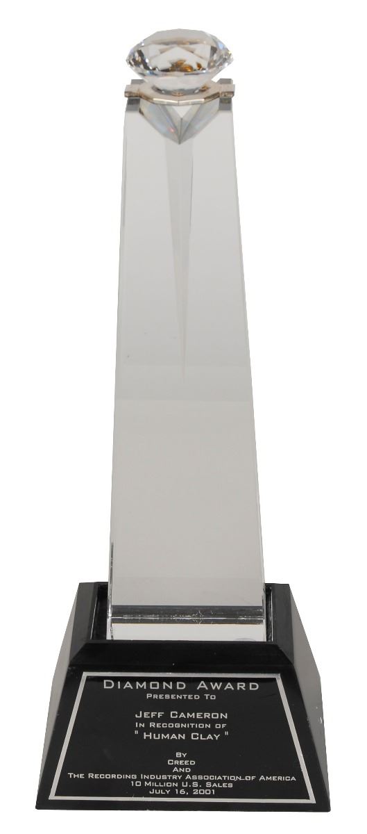 Official RIAA Diamond Award commemorating the success of Creed’s 1999 album Human Clay, measuring 16? tall and weighing 10.35 pounds, consisting of a large crystal diamond displayed atop a glass obelisk set upon a black base, with an engraved plaque reading: “Diamond Award, Presented to Jeff Cameron in recognition of ‘Human Clay,’ by Creed and the Recording Industry Association of America, 10 Million U.S. Sales, July 16, 2001.” In very good to fine condition, with the diamond and metal support re-glued at the top. Designed by Peter Wayne Yenawine, a master designer at Steuben Glass, these distinctive diamond award sculptures are made of fine lead crystal and of the utmost desirability.