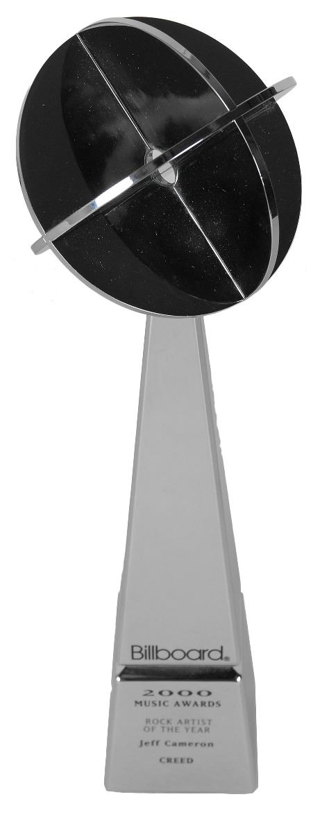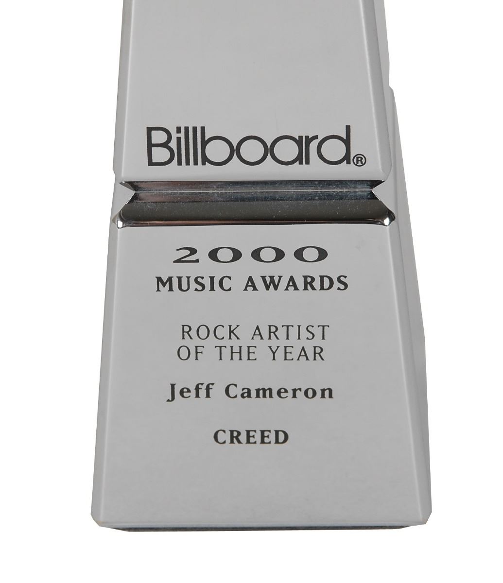 Official Billboard Music Award awarded to Creed for best rock artist in 2000, measuring 13.25? tall and weighing 5.2 pounds, with black text reading: “Billboard 2000 Music Awards, Rock Artist of the Year, Jeff Cameron, Creed.” In fine condition.