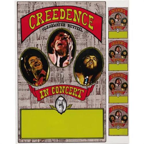 <B>Creedence Clearwater Revival Concert Poster with Uncut Handbills (1971).</B></I> A three-piece Creedence is pictured on this "stock" poster (with a blank area left for imprinting venue information). Included with the poster is a strip of four handbills that would have been cut apart after imprinting. The overall size is 23" x 29", and is in NM condition. Rare and unusual!<BR><BR><b>Shipping:</b> Flat Material, Large (<a target="_blank" href="http://www.heritageauctions.com/common/shipping.php">view shipping information</a>)