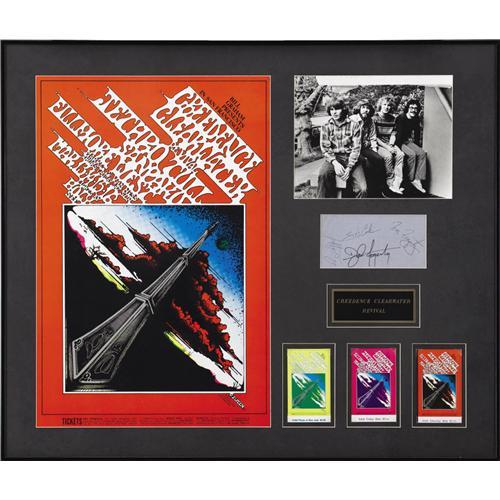 <B>Creedence Clearwater Revival Fillmore Concert Poster #BG164 with Ticket Set, Photo and Autograph Set (Bill Graham, 1969)</B></I> San Francisco's Creedence Clearwater Revival had been kicking around the Bay Area for a number of years by 1969. In their orignal format, as the Golliwogs, they were fronted by Tom Fogerty, who led the band through a number of near-hit singles. Signed to the Fantasy label as Creedence, and with John Fogerty as the frontman, they found "instant" fame with the 1968 single "Suzy Q". More success followed, but in the end, a bitter dispute with Fantasy split the band and left the Fogerty brothers on less than friendly terms, a situation that continued through to Tom's death in 1990. This handsome 29.5" x 25" framed and matted item includes a NM copy of the Randy Tuten-designed poster for the four-night event (co-starring Jethro Tull), a set of three tickets (with one doubling for Thursday or Sunday), an 8" x 10" black and white photo of the band, plus all four signatures on a grey piece of paper. All items are in NM condition.