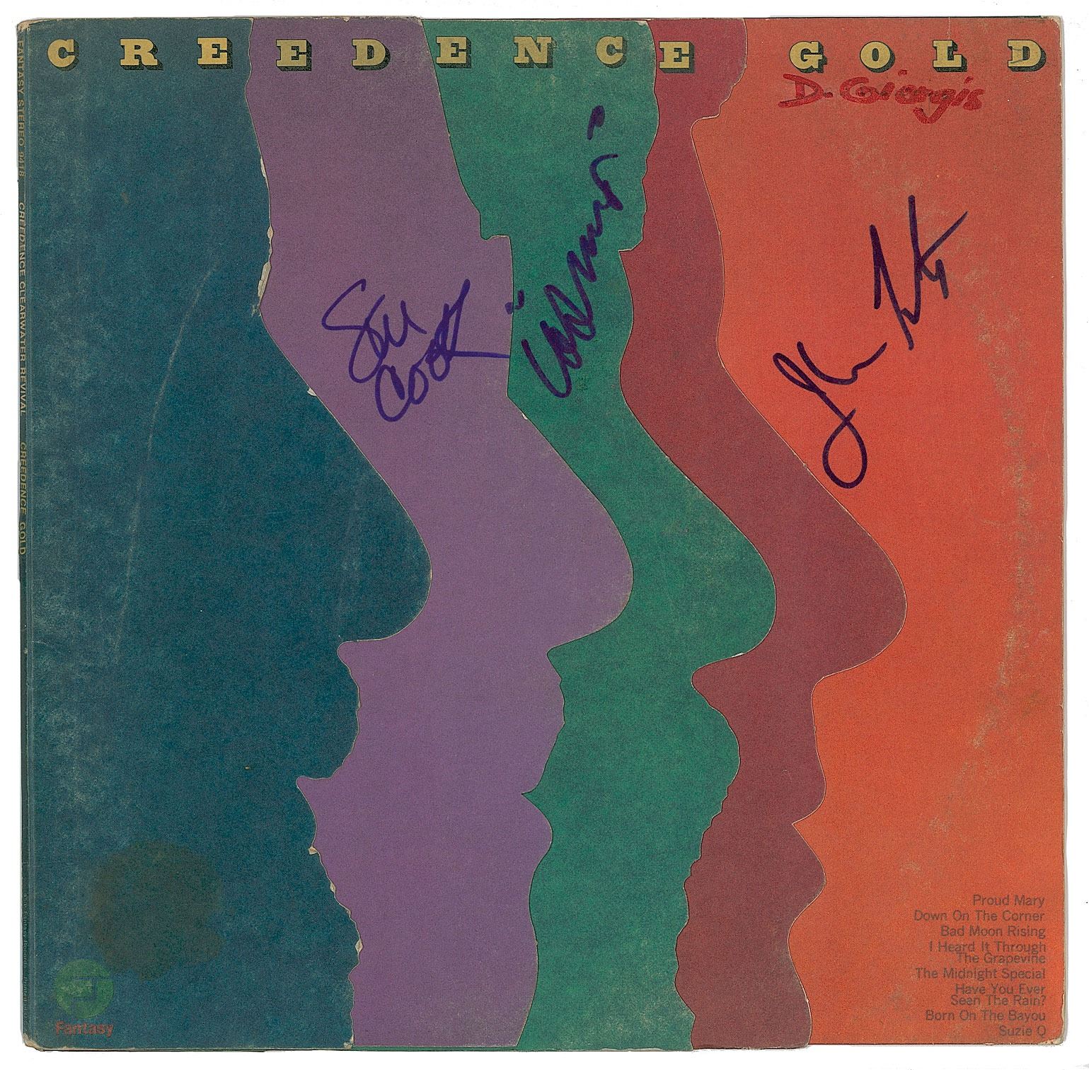 Creedence Gold album signed on the front cover in blue felt tip by John Fogerty, Stu Cook, and Doug 'Cosmo' Clifford. In fine condition, with light scuffing, and an ownership signature to the upper edge. The record is not included.