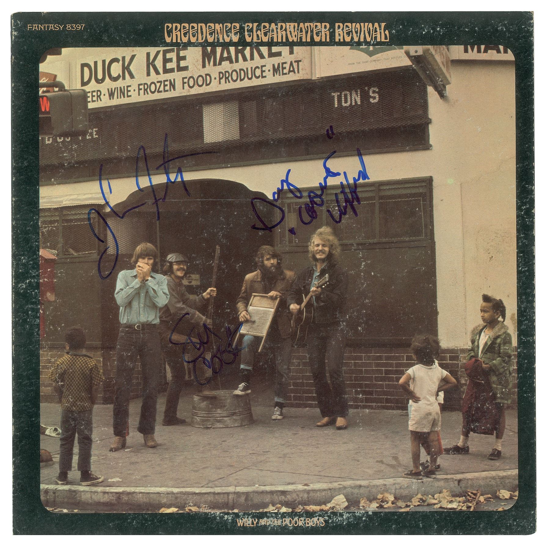 Willy and the Poor Boys album signed on the front cover in blue felt tip by John Fogerty, Stu Cook, and Doug 'Cosmo' Clifford. In fine condition, with light scuffing. The record is not included.