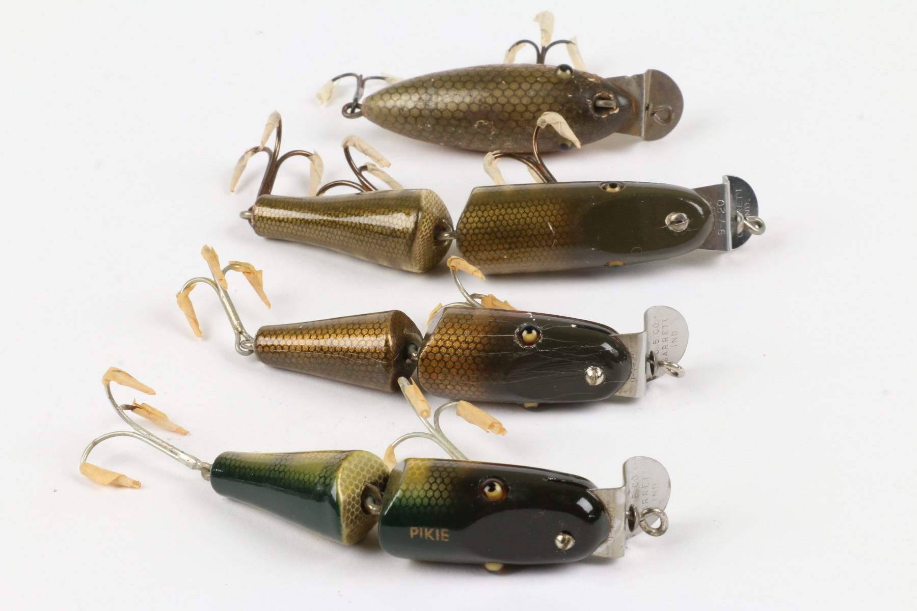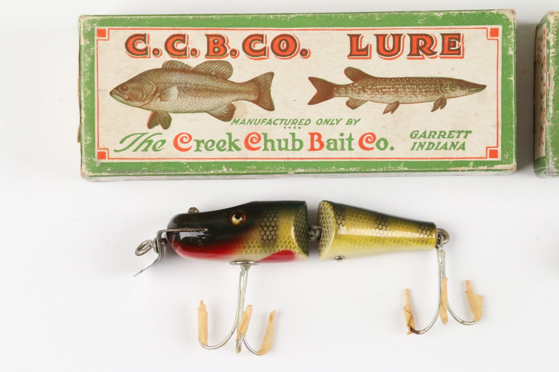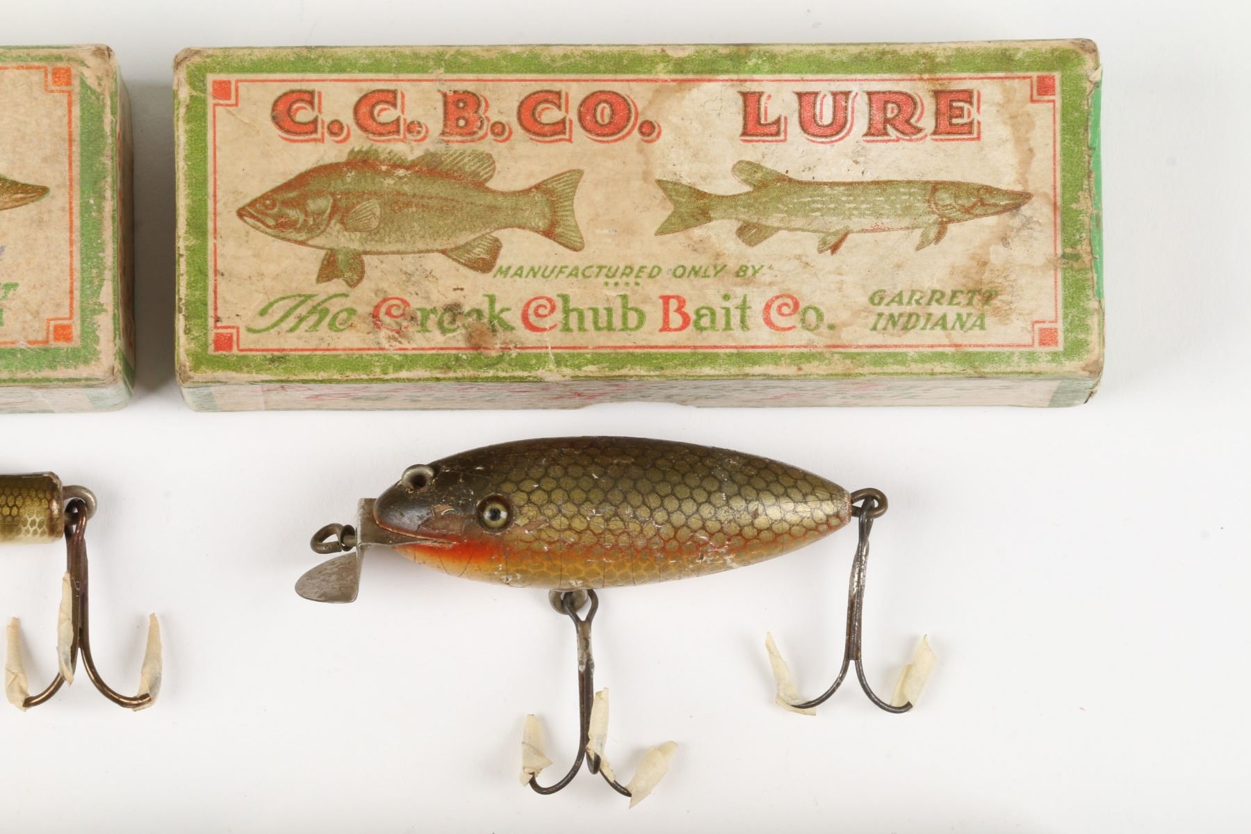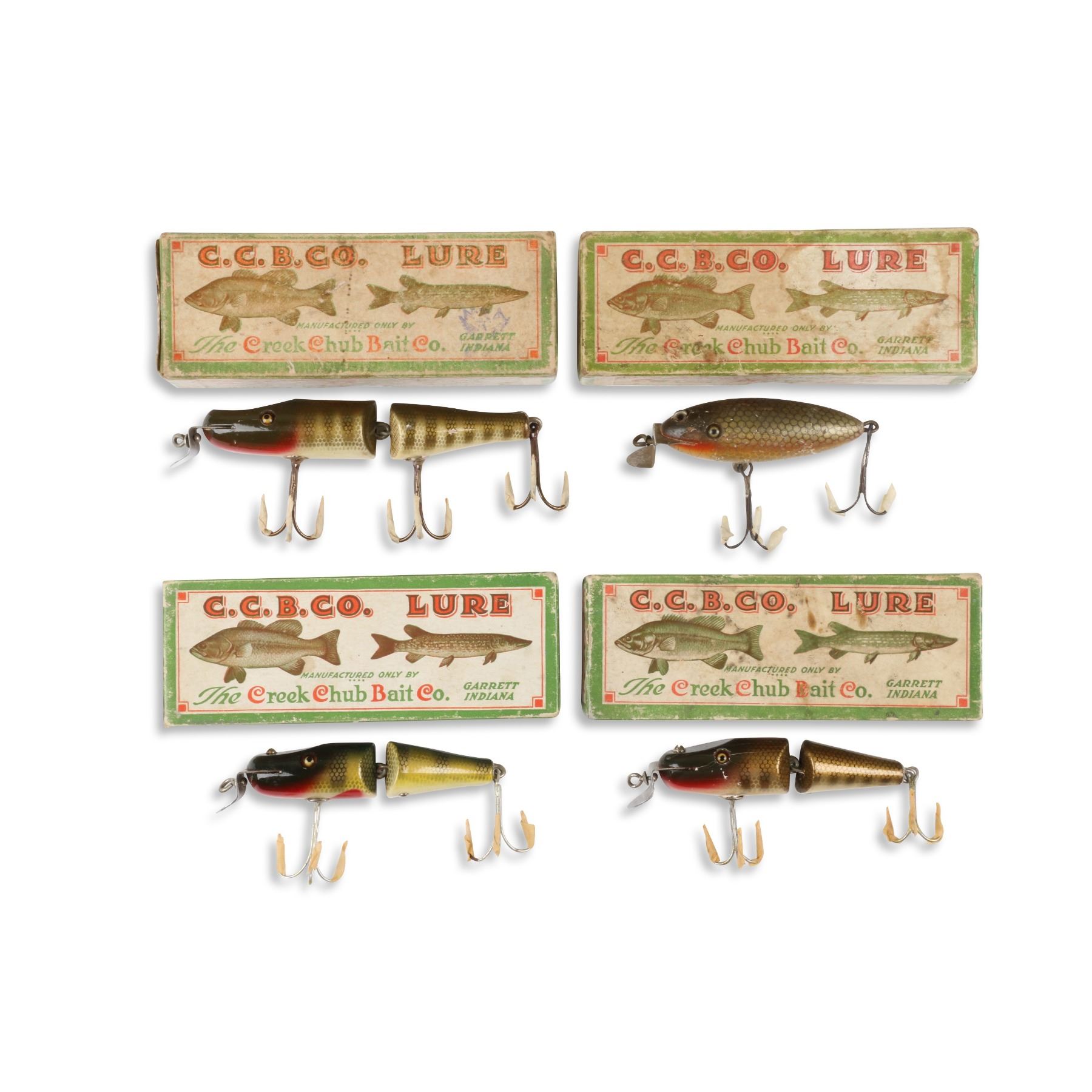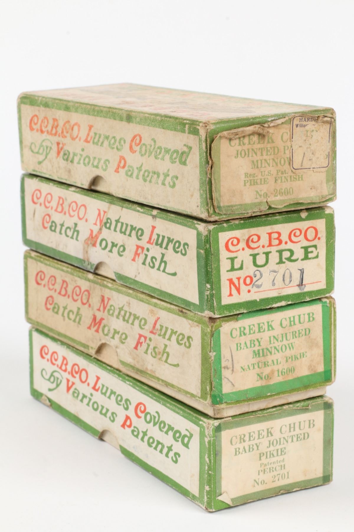 Creek Chub Bait Company, United States. 1940s. Boxed. Natural Scale, Pike Scale and Perch. Material: Wood. Quantity: 4. Grade: G. 5.25" boxes. Est. $75-100.