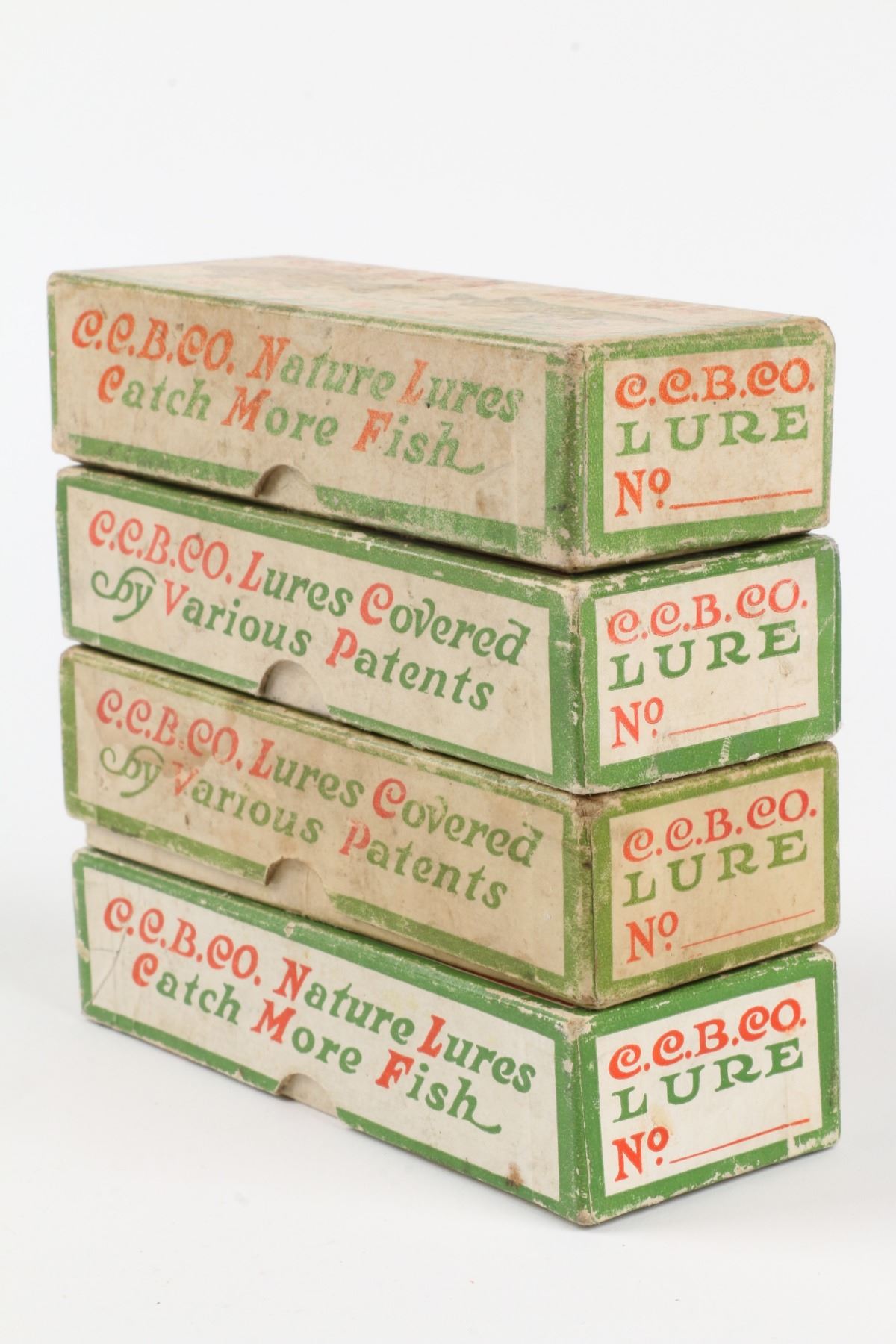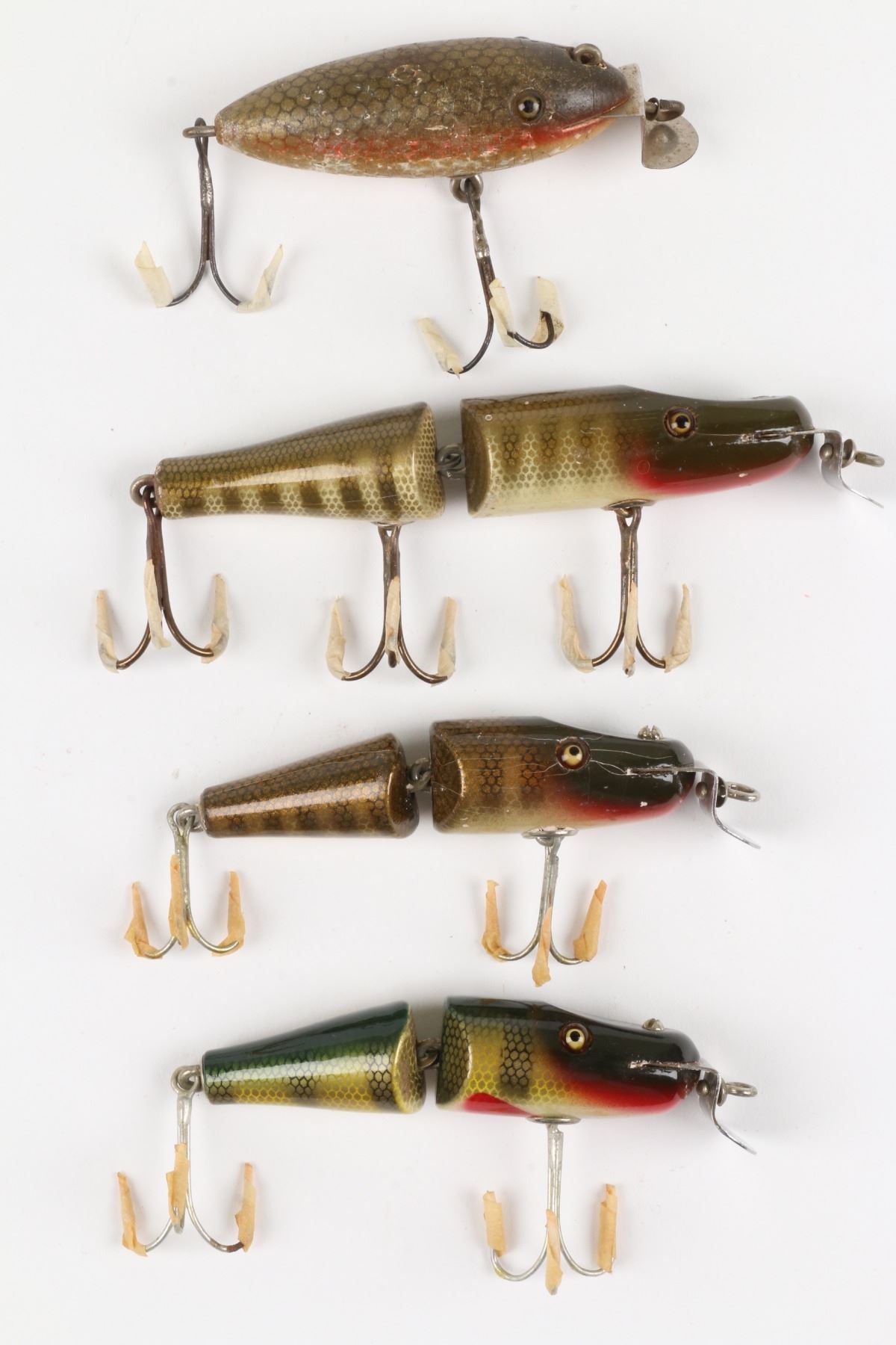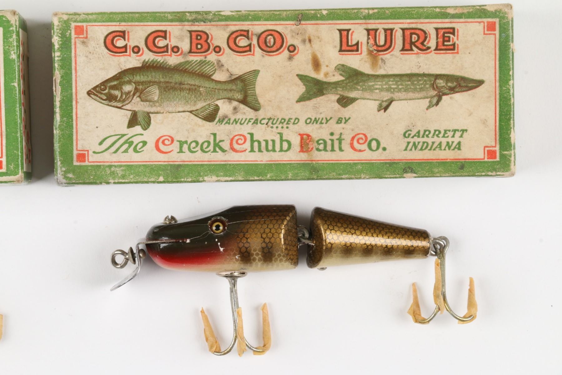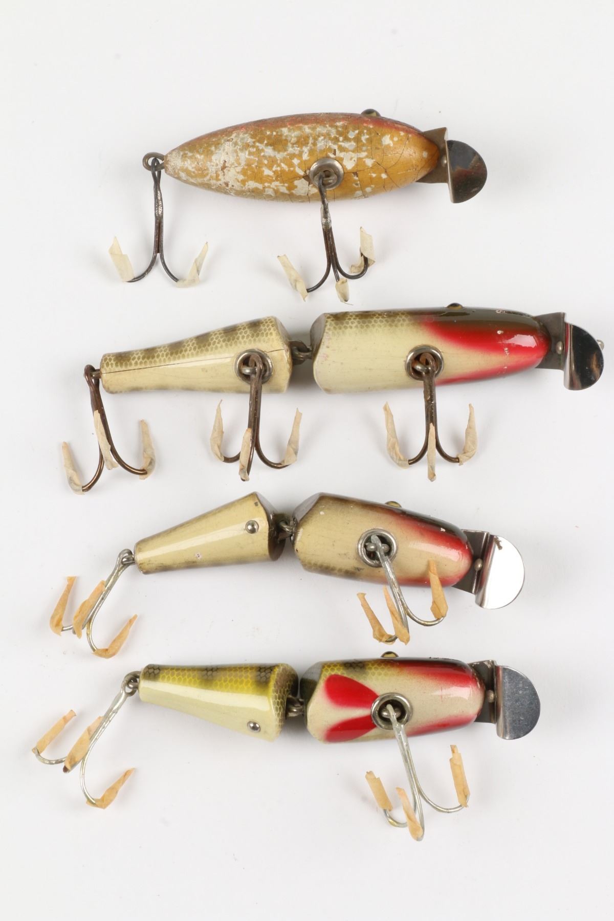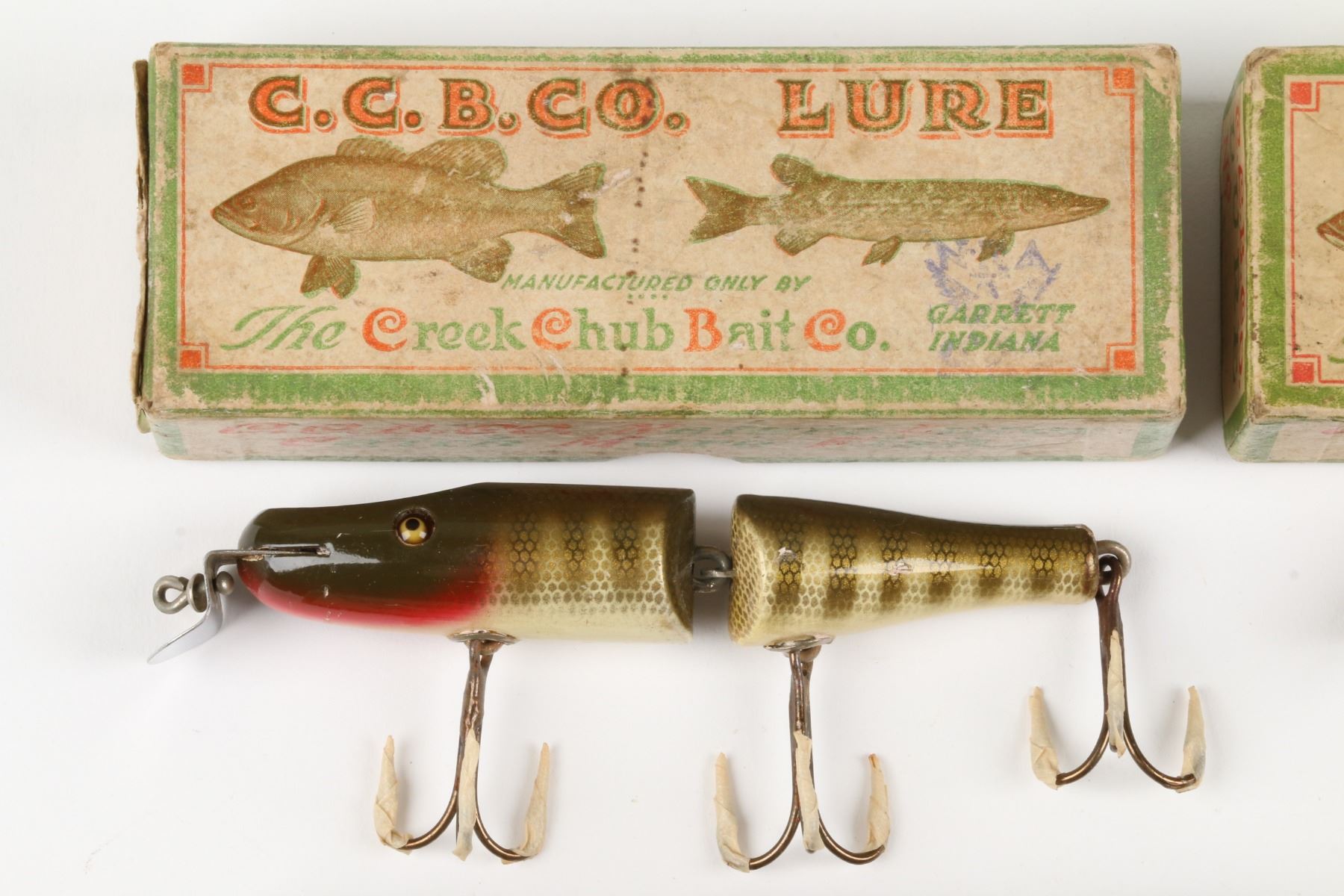Creek Chub Bait Company, United States. 1940s. Boxed. Natural Scale, Pike Scale and Perch. Material: Wood. Quantity: 4. Grade: G. 5.25" boxes. Est. $75-100.