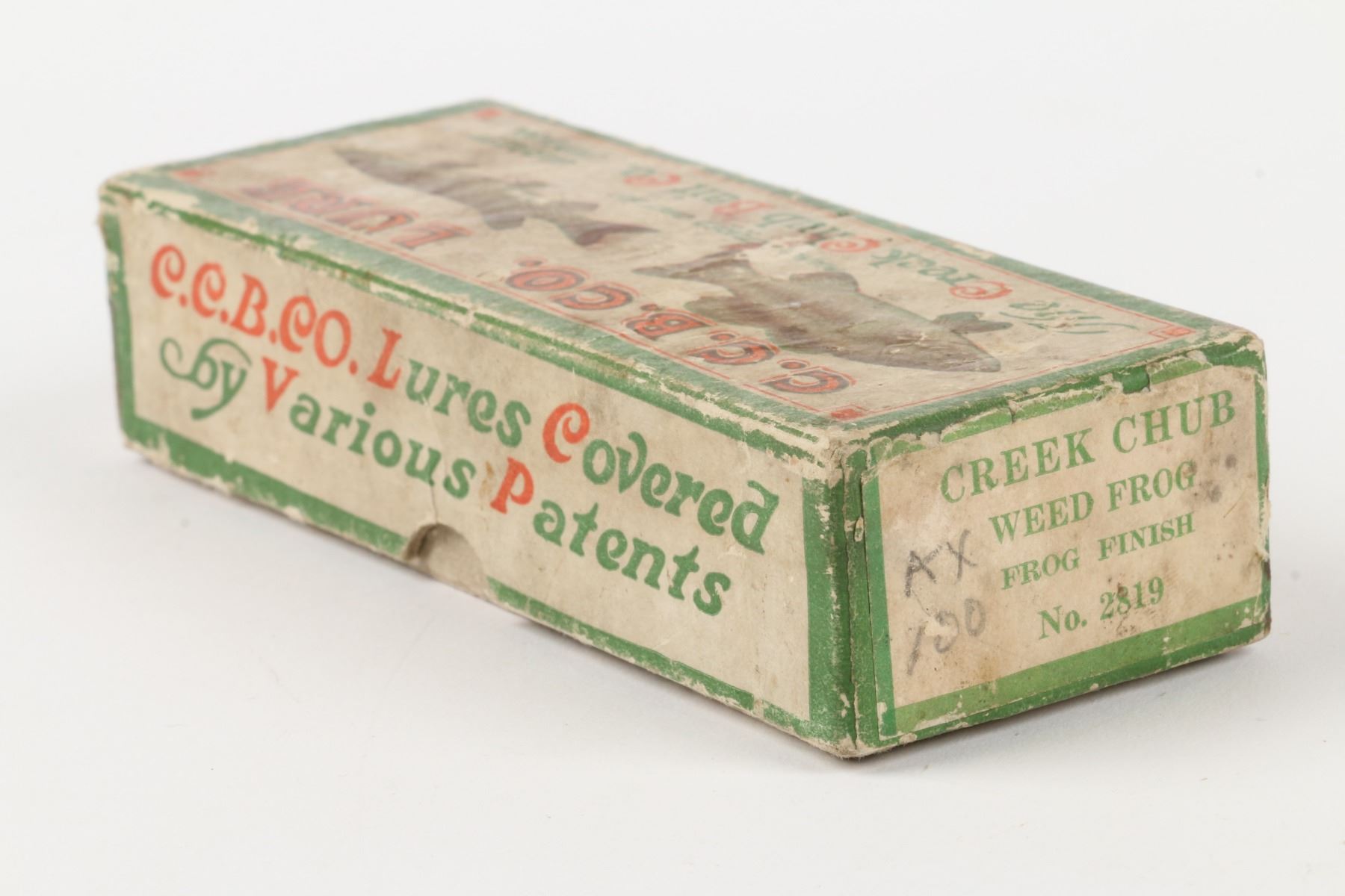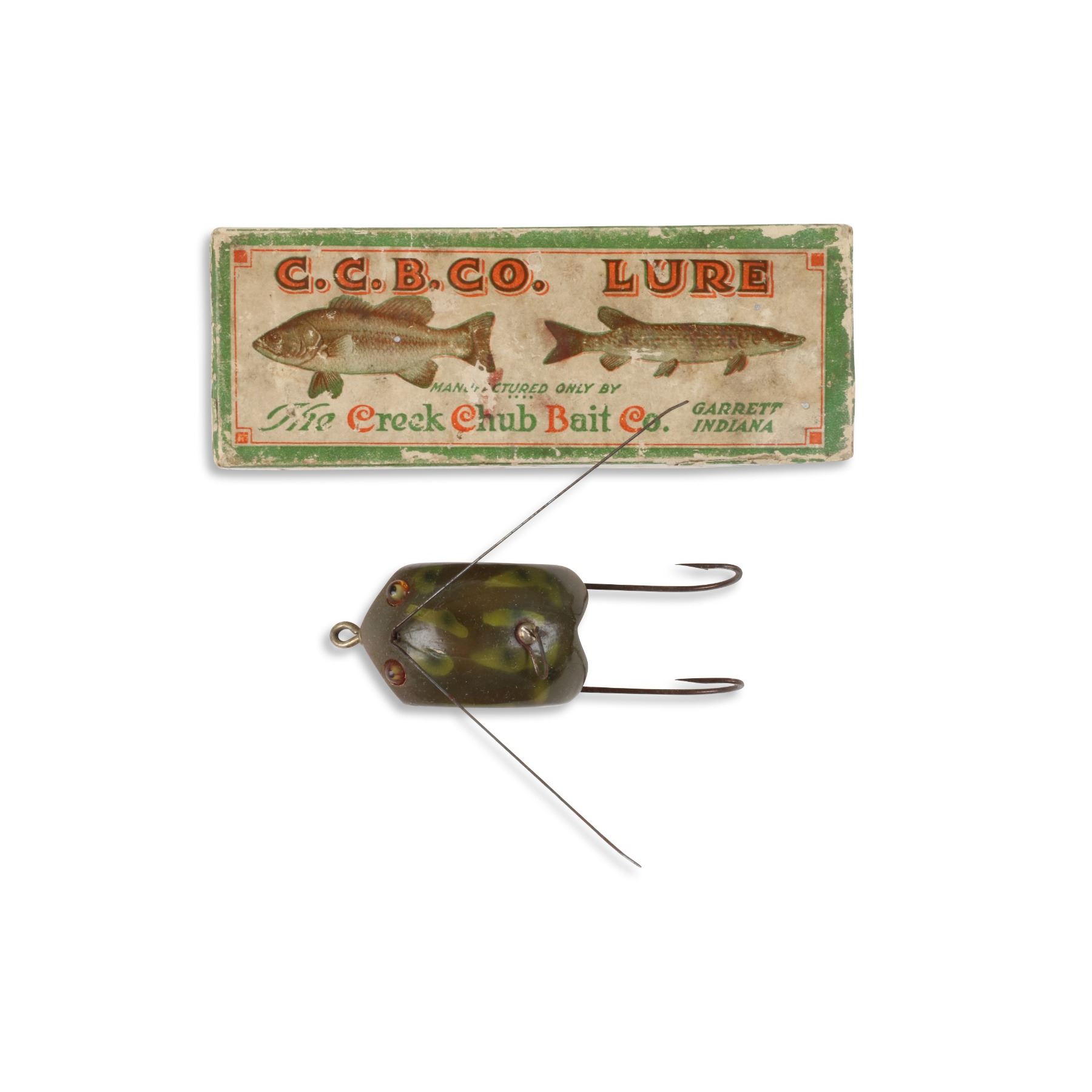 Creek Chub Bait Company, United States. 1920s. Boxed. Frog Finish. Material: Wood. Quantity: 1. Grade: VG+. 5.25" box. Est. $250-300.