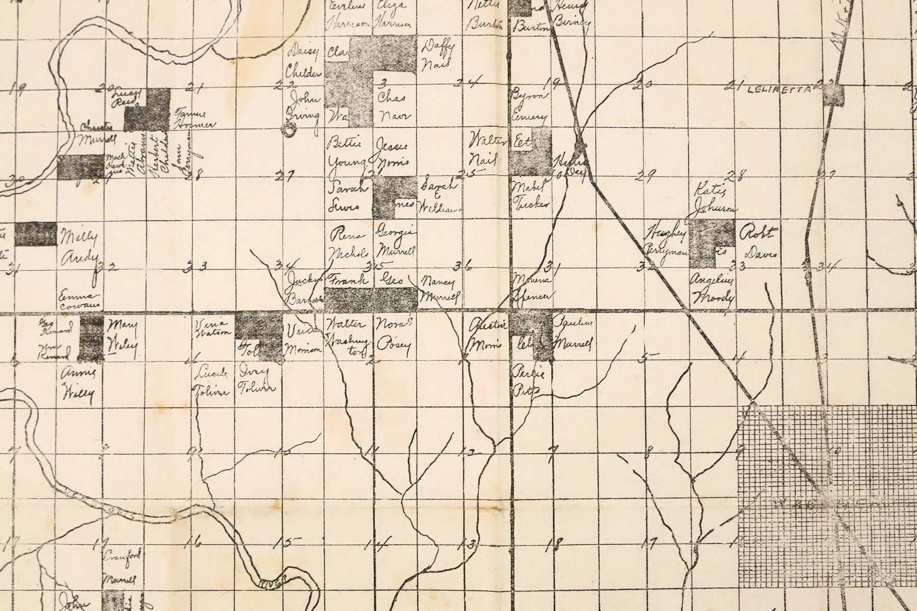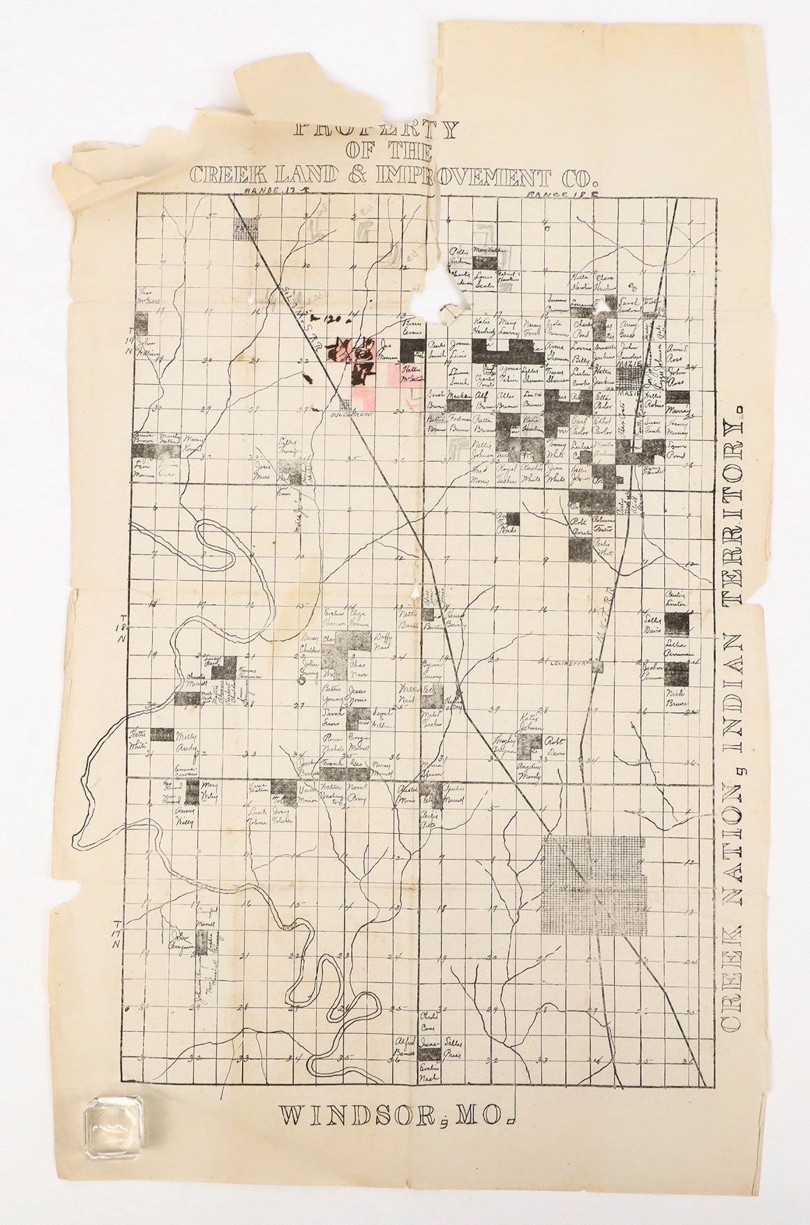 Creek Land & Improvement Indian Territory Map, Windsor, Missouri. Possibly c1899. 12x21 ". Very delicate cond. Some tears and has been folded extensively. Map w/names on land plots.