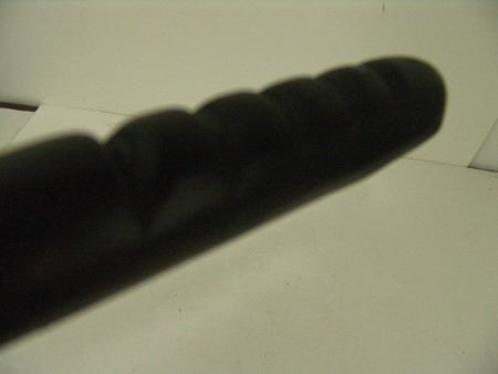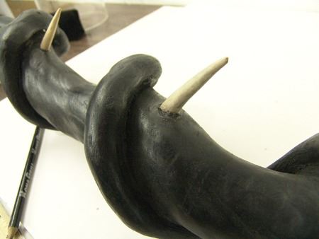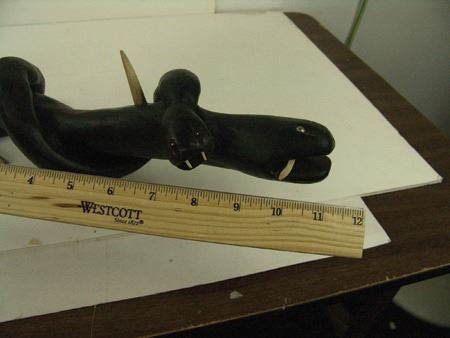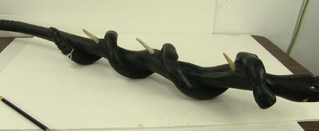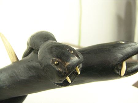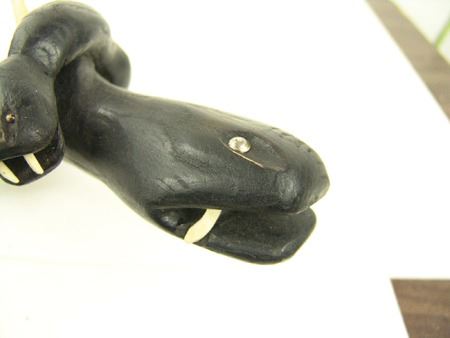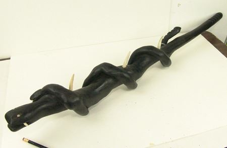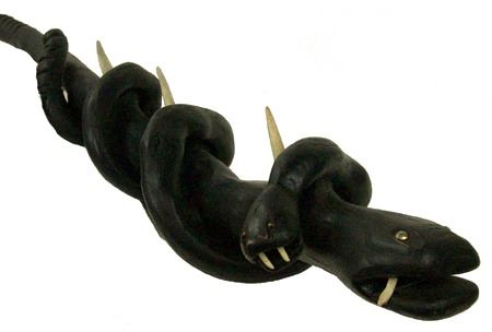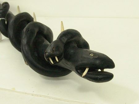 Ca. 1970s, Intense looking hand carved black wooden club showing two snakes, one wrapped around the other, both with wicked carved bone teeth and spikes, and with small brass tacks for eyes. Very good condition. 37"
