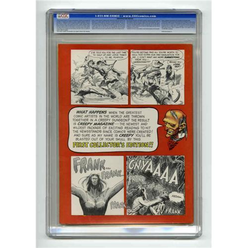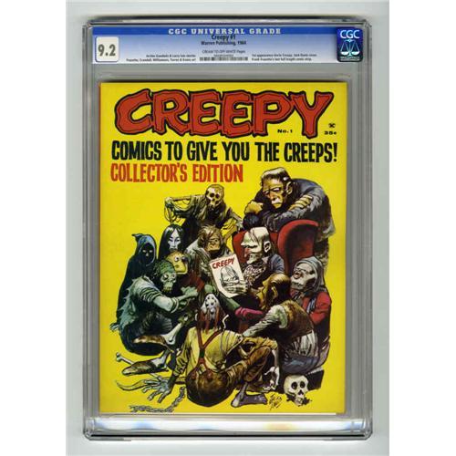 <B>Creepy #1 (Warren, 1964) CGC NM- 9.2 Cream to off-white pages.</B></I> Warren's first full-length horror comic magazine. First appearance of Uncle Creepy. Jack Davis cover. Interior art by Frank Frazetta (believed to be his last comic book story), Joe Orlando, Al Williamson, Reed Crandall, Gray Morrow, and Angelo Torres. Overstreet 2005 NM- 9.2 value = $160. CGC census 11/05: 9 in 9.2, 7 higher.