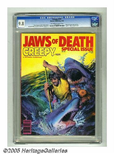 <B>Creepy #101 (Warren, 1978) CGC NM/MT 9.8 Off-white to white pages.</B></I> Special "jaws of death" issue. Richard Corben cover. Corben, Alex Nino, Alfredo Alcala, and Pablo Marcos art. Overstreet 2005 NM- 9.2 value = $18. CGC census 1/05: 3 in 9.8, none higher. <I>From the collection of Chris Bell.</B></I>