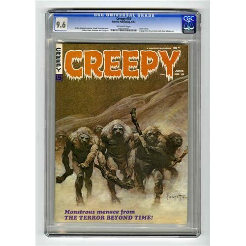 <B>Creepy #15 (Warren, 1967) CGC NM+ 9.6 Off-white pages.</B></I> Classic Frank Frazetta cover. Interior art by Neal Adams, Steve Ditko, Gil Kane, Joe Orlando, and Johnny Craig. Overstreet 2005 NM- 9.2 value = $45. CGC census 11/05: 8 in 9.6, 4 higher.