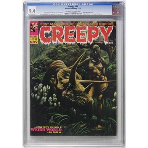 <B>Creepy #36 (Warren, 1970) CGC NM 9.4 Off-white to white pages.</B></I> Kenneth Smith cover. Richard Corben's first work for Warren. Artists include Corben, Tom Sutton, and Rich Buckler. Overstreet 2007 NM- 9.2 value = $45. CGC census 10/07: 4 in 9.4, 2 higher.<BR><BR><b>Shipping:</b> Comics - Slabbed (certified) (<a target="_blank" href="http://www.heritageauctions.com/common/shipping.php">view shipping information</a>)