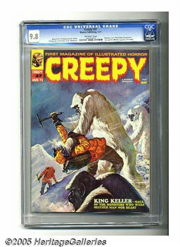 <B>Creepy #37 (Warren, 1971) CGC NM/MT 9.8 Off-white pages.</B></I> Ken Barr cover. Tom Sutton, Syd Shores, Mike Royer, Ernie Colon, and Pat Boyette art. Last page has the first use of color in a Warren magazine. Overstreet 2005 NM- 9.2 value = $30. CGC census 1/05: 4 in 9.8, none higher. <I>From the collection of Chris Bell.</B></I>