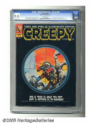 <B>Creepy #40 (Warren, 1971) CGC NM/MT 9.8 Off-white pages.</B></I> Vaughn Bode and Larry Todd cover. Tom Sutton, Dave Cockrum, Pablo Marcos, and George Roussos art. Overstreet 2005 NM- 9.2 value = $30. CGC census 1/05: 2 in 9.8, none higher. <I>From the collection of Chris Bell.</B></I>