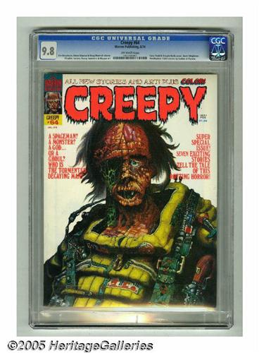 <B>Creepy #64 (Warren, 1974) CGC NM/MT 9.8 Off-white pages.</B></I> Larry Todd and Vaughn Bode cover. Richard Corben, Esteban Maroto, Howard Chaykin, and Tom Sutton art. Overstreet 2005 NM- 9.2 value = $35. CGC census 1/05: 1 in 9.8, none higher. <I>From the collection of Chris Bell.</B></I>
