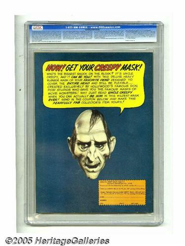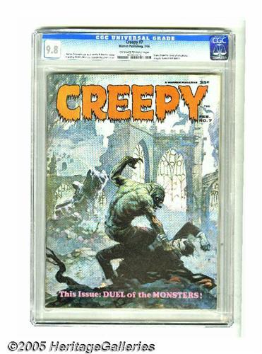 <B>Creepy #7 (Warren, 1966) CGC NM/MT 9.8 Off-white to white pages.</B></I> Frank Frazetta and Roy Krenkel cover. Frazetta, Alex Toth, Joe Orlando, Angelo Torres, Gray Morrow, Reed Crandall, and John Severin art. Overstreet 2005 NM- 9.2 value = $45. CGC census 1/05: 2 in 9.8, none higher. <I>From the collection of Chris Bell.</B></I>