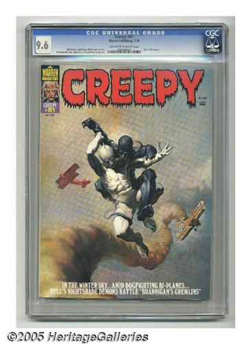 <B>Creepy #81 (Warren, 1976) CGC NM+ 9.6 Off-white to white pages.</B></I> Ken Kelly cover. Esteban Maroto, Paul Neary, and John Severin art. Overstreet 2005 NM- 9.2 value = $12. CGC census 1/05: 3 in 9.6, none higher. <I>From the collection of Chris Bell.</B></I>