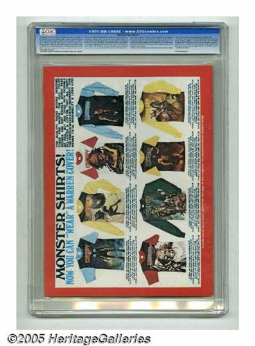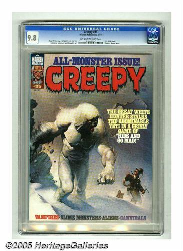 <B>Creepy #85 (Warren, 1977) CGC NM/MT 9.8 Off-white to white pages.</B></I> Monster theme issue. Ken Kelly cover. Carmine Infantino, Walt Simonson, and Martin Salvador art. Overstreet 2005 NM- 9.2 value = $12. CGC census 1/05: 3 in 9.8, none higher. <I>From the collection of Chris Bell.</B></I>