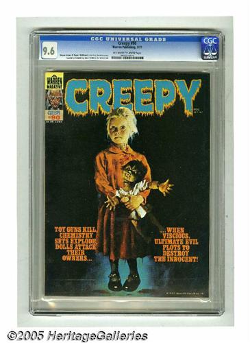 <B>Creepy #90 (Warren, 1977) CGC NM+ 9.6 Off-white to white pages.</B></I> Enrich Torres cover. Art by Carmine Infantino, Jose Ortiz, and Rafael Auraleon. Overstreet 2005 NM- 9.2 value = $12. CGC census 1/05: 3 in 9.6, 1 higher. <I>From the collection of Chris Bell.</B></I>