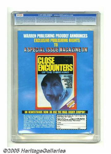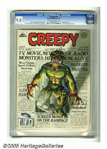 <B>Creepy #98 (Warren, 1978) CGC NM/MT 9.8 Off-white to white pages.</B></I> Carmine Infantino and Dick Giordano art. Attila Hejje cover. Overstreet 2005 NM- 9.2 value = $12. CGC census 1/05: 2 in 9.8, none higher. <I>From the collection of Chris Bell.</B></I>