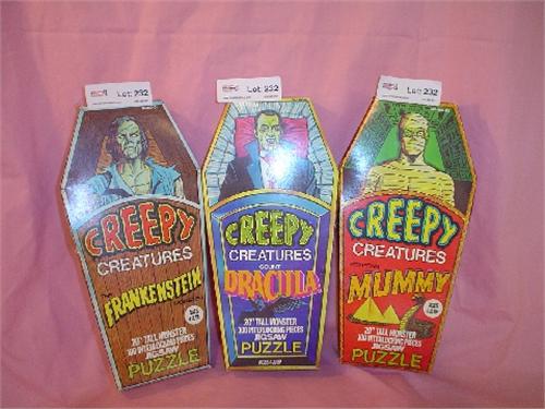 "Creepy Creatures" 3 Puzzles in Mummy Coffin original Boxes - All 1975