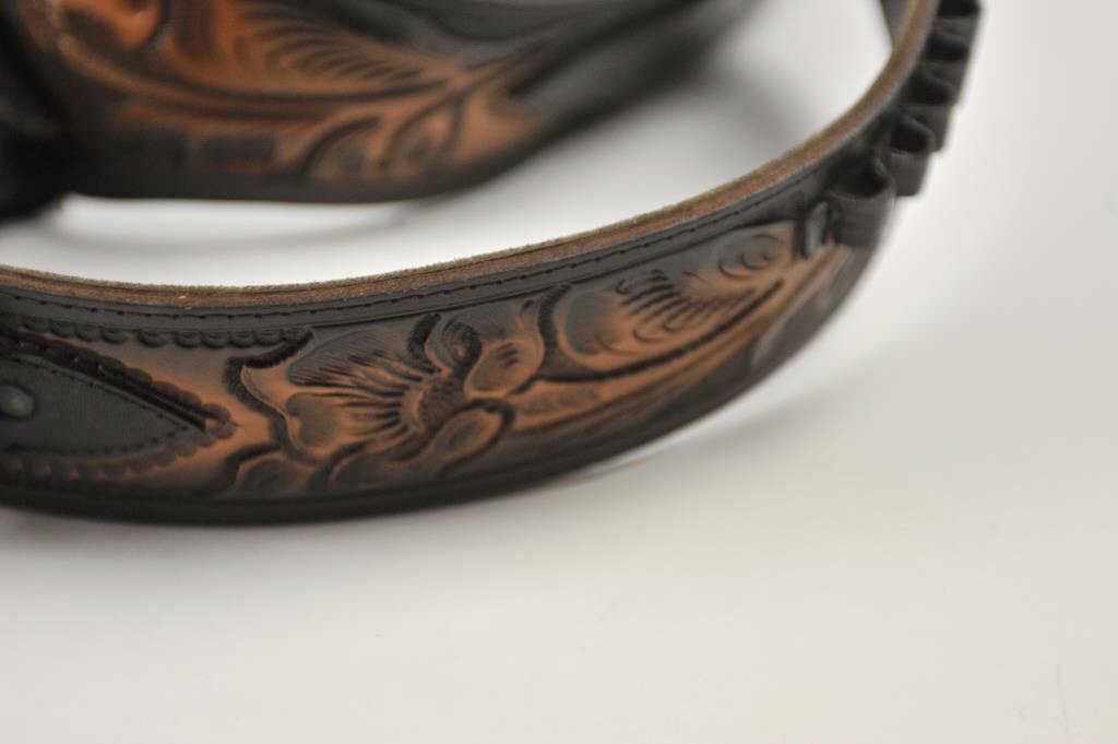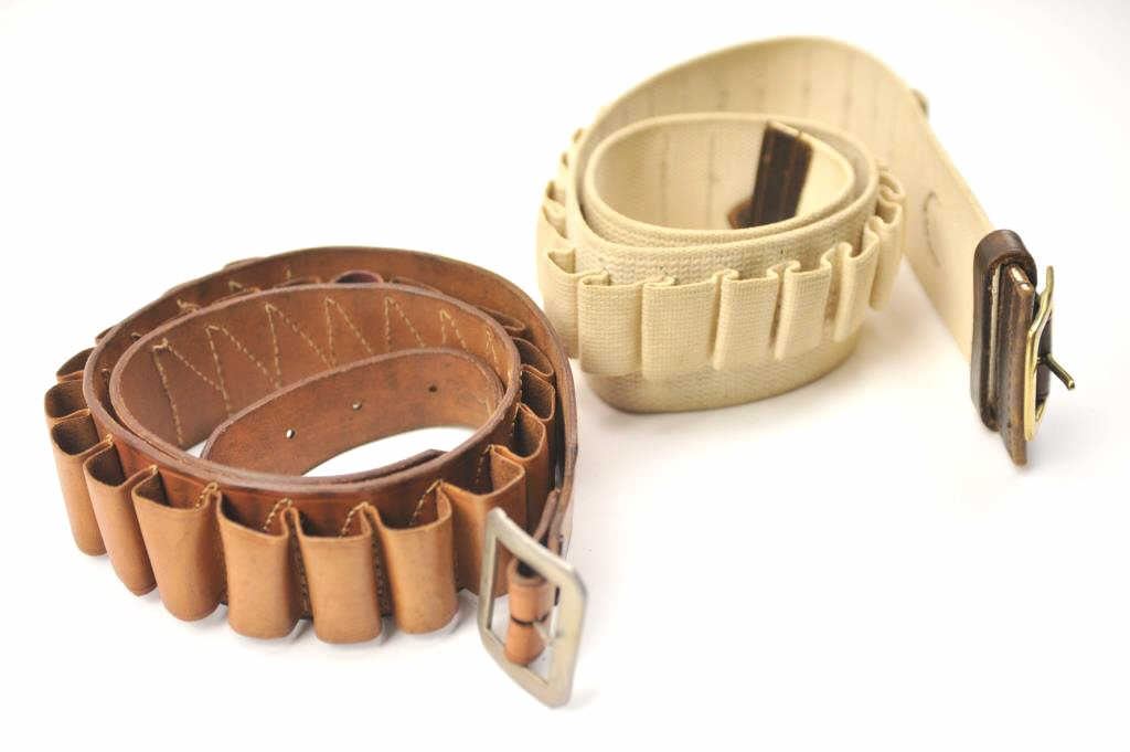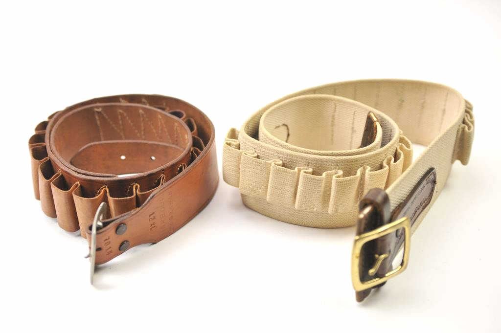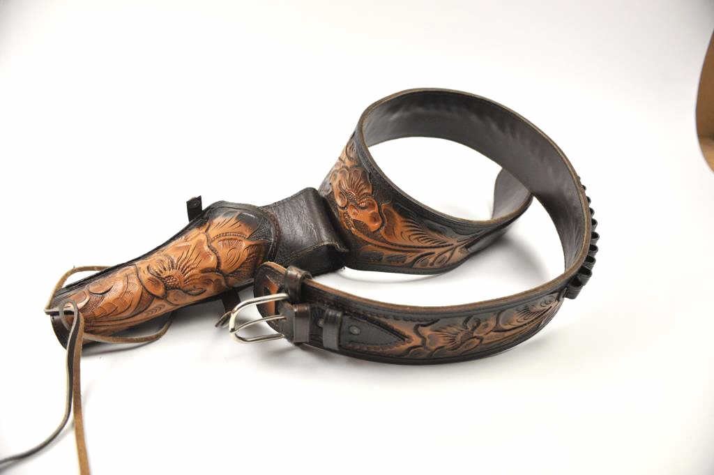 Creger Leather of Tustin, leather and fabric cartridge belt for 12 gauge shotgun shells in an Old West style. The rig is 34”-38” across the belt in good condition. Plain leather 12 gauge cartridge belt also 34”-38”. Western tooled leather gun belt and holster for a medium framed 4” revolver with .38 caliber loops, also 34”-38” marked, Lopez-Mexico. All items are in very good condition. Est.: $150-$300.
