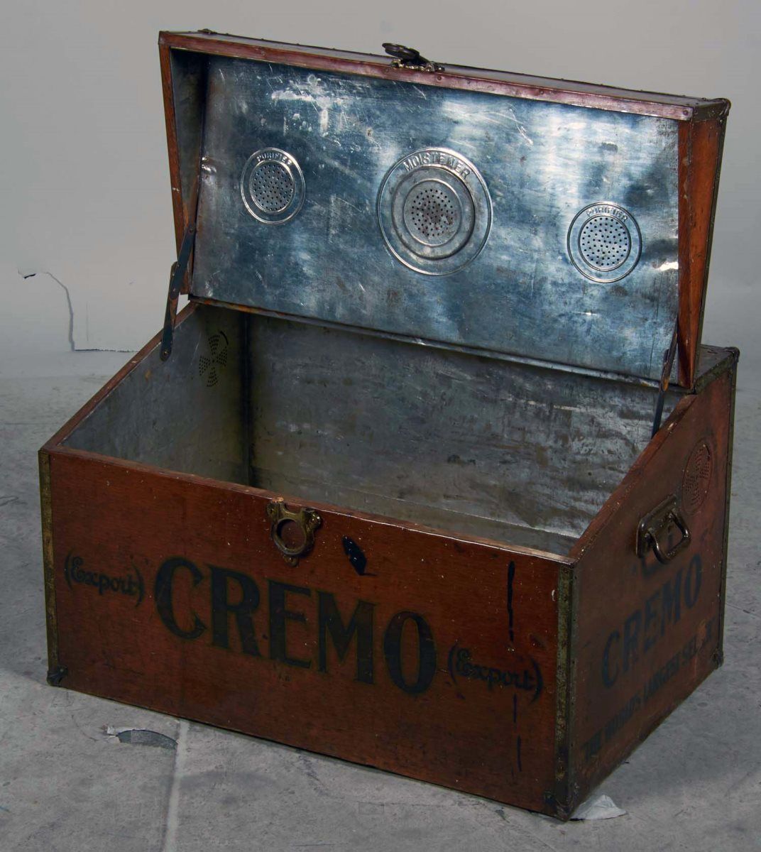 w/ metal side handles, Directions printed on top, "Cremo - The World's Largest Seller - Always In Perfect Condition" w/ "Moistener" & "Purifier" vents inside & open/close ventilators on sides, Shows some wear Condition Good Size 28" x 18" x 16-1/2"h