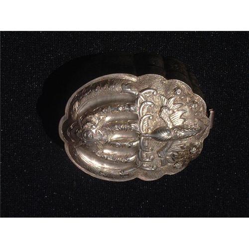Continental silver box of oblong shape with crenelated sides and intricate repousse and incised decorations. The interior is divided by a metal band in a round partition and a smaller partition above. It has a mark on the bottom that could not be identified. Estimated value: $750.