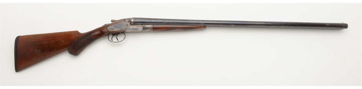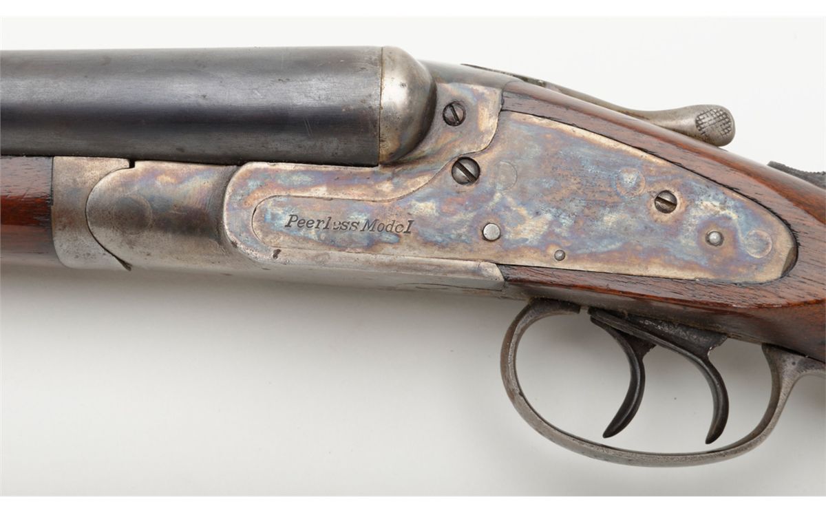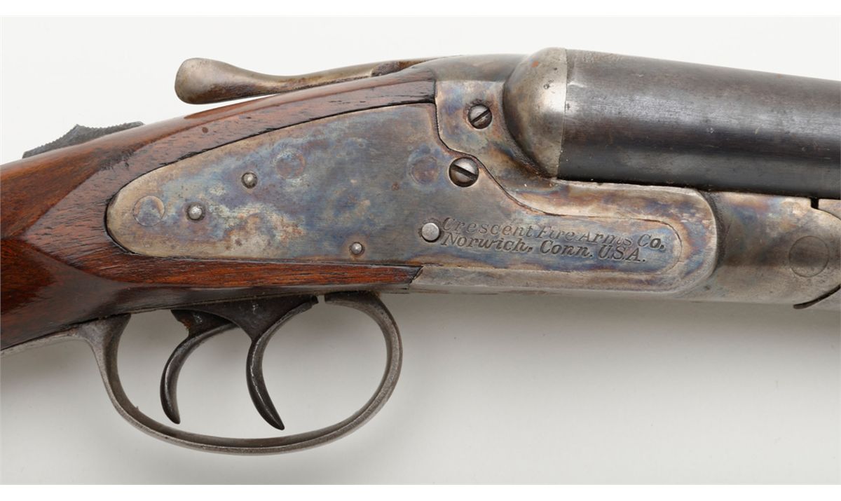 Crescent Arms Peerless Model SxS Shotgun, cal. 12 gauge, serial #240050. The shotgun is in overall good condition with 30” barrels. The barrels retain a significant amount of blue, while the action shows a great deal of case color. Additionally, There is some light pitting and surface rust evident on the action and barrels. The checkered wood stocks have significant loss of finish, with mars and compression marks consistent with use. The stock ends in a black plastic butt plate. The bores are good and may clean. Est.:$350-$700 (Modern/PPT)