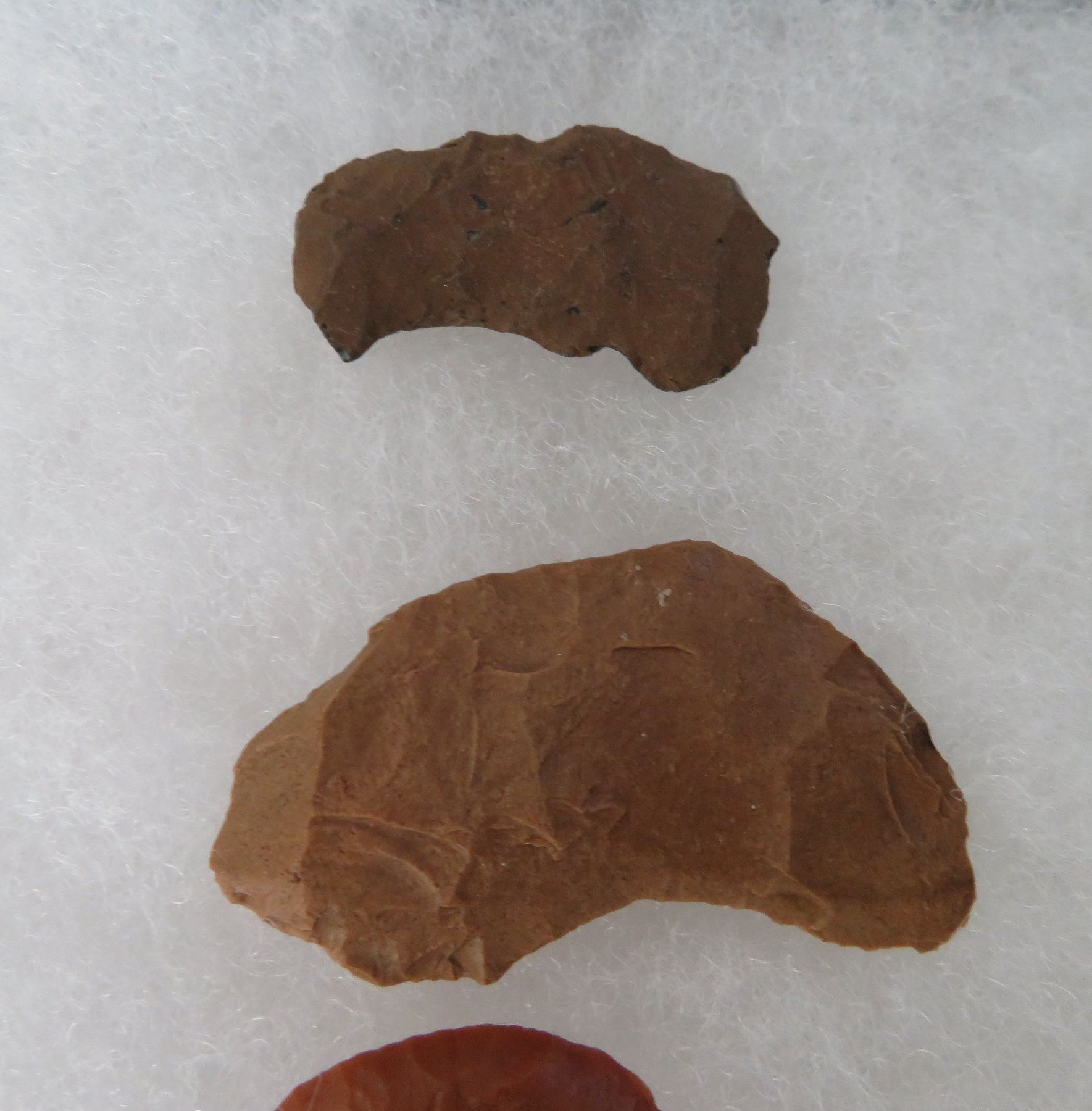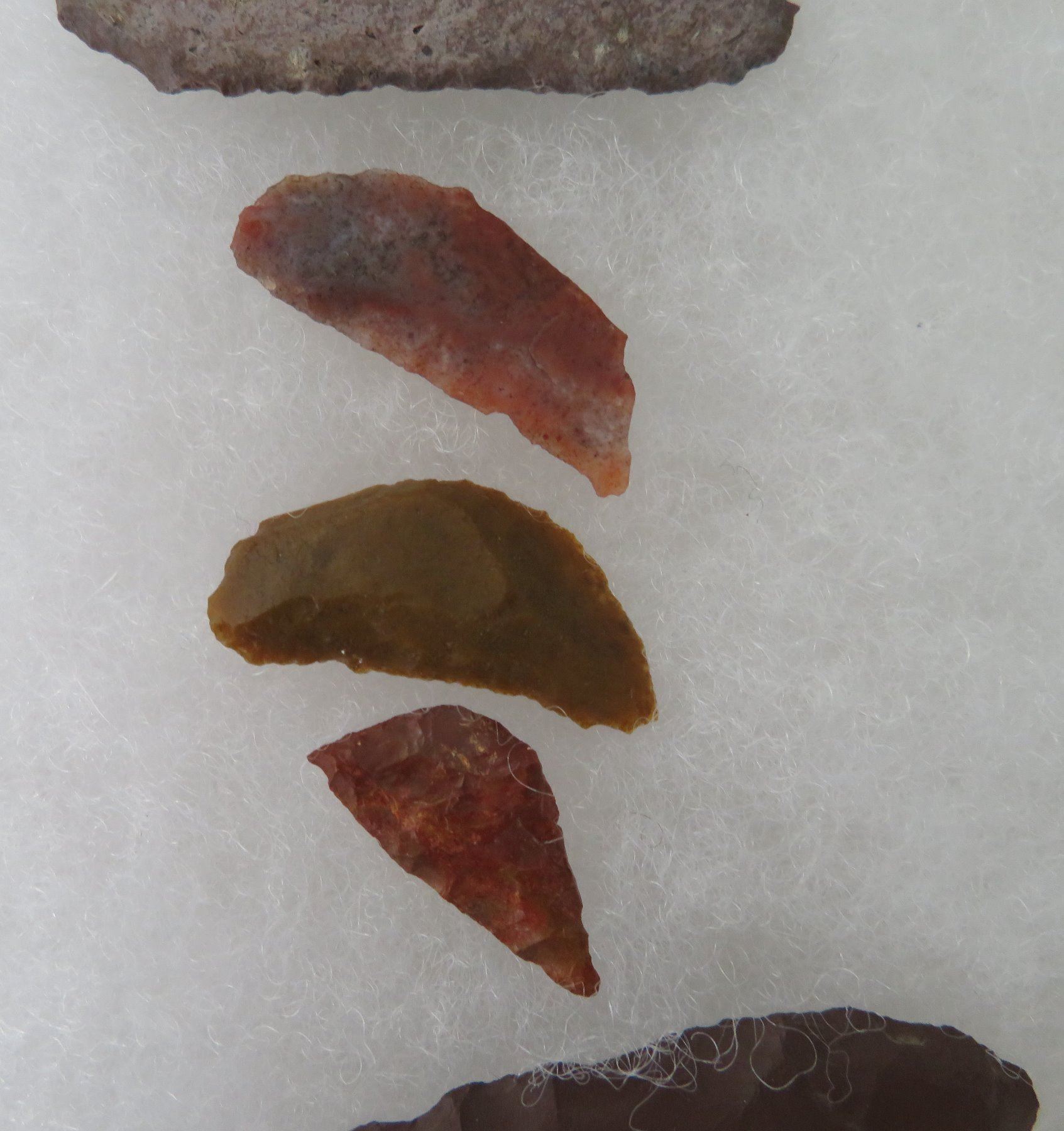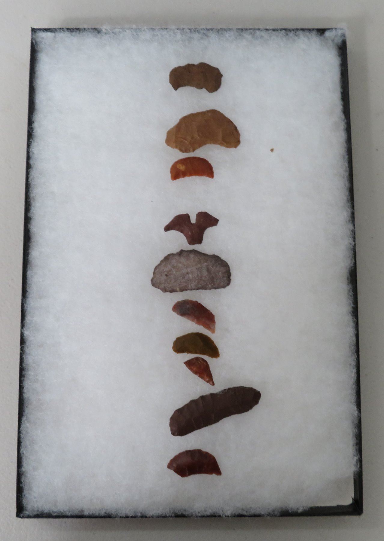Crescent Collection, pre-historic items. Made of chert-stone, the items measure from 7/8" to 2 1/4" long. Fresno County, California. From a 60-year-old California collection. Frame not included. Condition: As found, see images. Shipping: $20.00 w/insurance and signature, due to value.