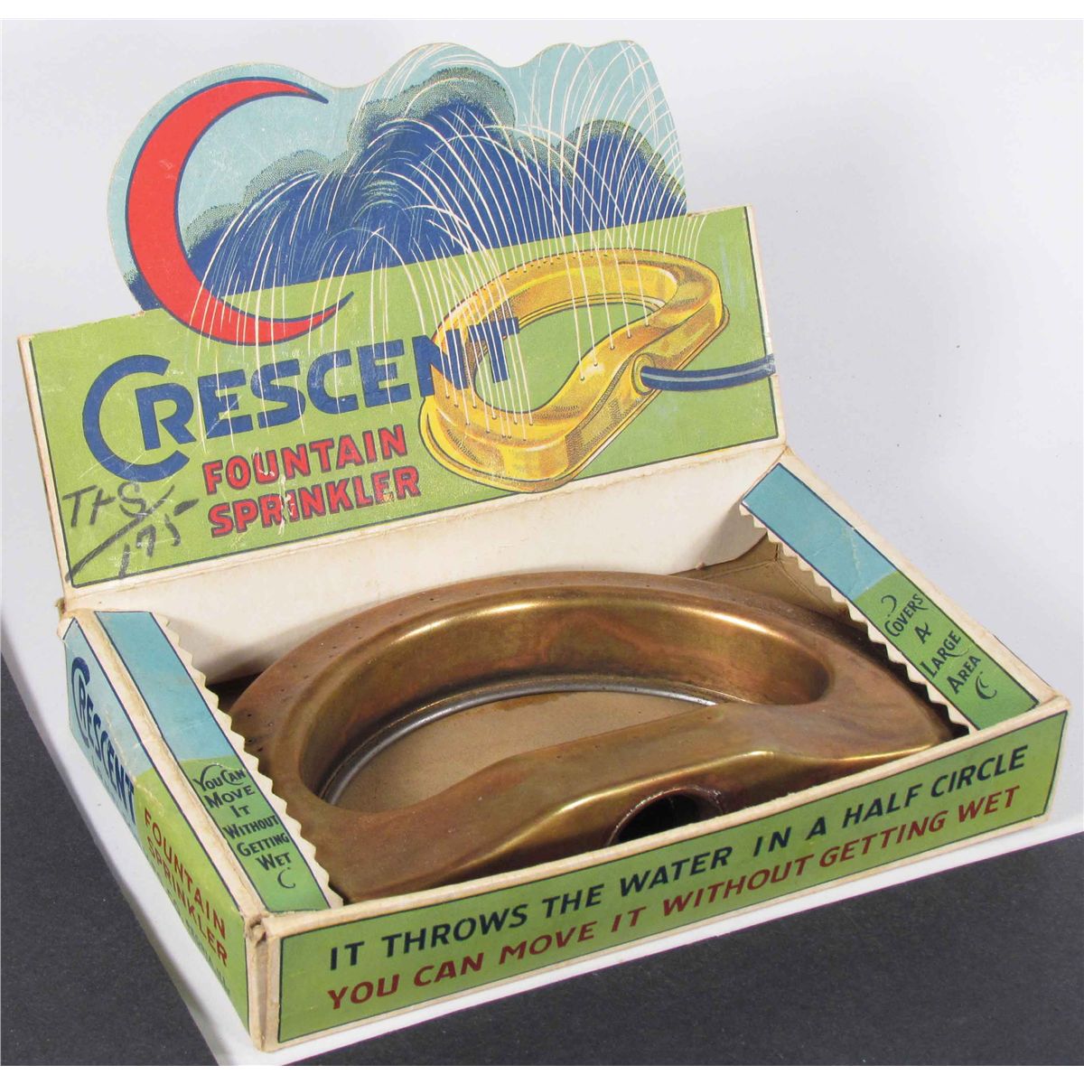 Crescent Fountain Sprinkler Cardboard Store Display with product. Price marked on front flap otherwise excellent overall condition. 8 1/2 X 7 3/4 X 5 3/4 inches.