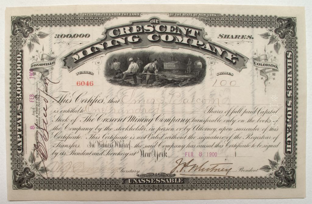 Incorporated in New York. Cert. # 6046 issued to Elmer I. Balcom for 100 shares, and endorsed by him on reverse. Signed by J. P. Whitney, president, and by W.J. Downing, secretary. U/C. Underground mining vignette at center. Black border on crème paper. Printer: ABNCo. “Leadville, Colorado” is printed beside masthead. Datelined New York. Today the area is a popular camping site. VF.City: LeadvilleCounty: LakeState: CO