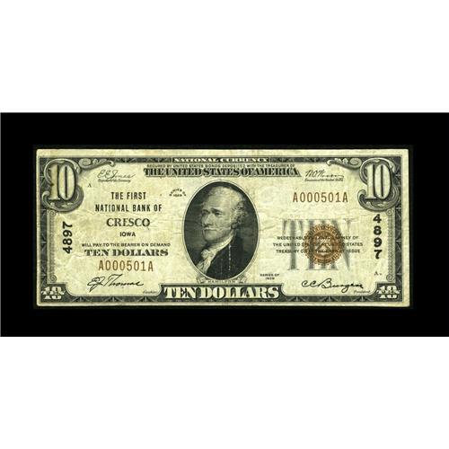<B>Cresco, IA</B></I> - $10 1929 Ty. 1 <B>The First NB</B></I> Ch. # 4897<BR>This small Howard County locale supported this institution as its only federally chartered issuer. This <B>Fine</B></I> addition to the census brings the population of documented survivors from here in this type and denomination to just four pieces. We suspect that the hammer will fall in the range of...