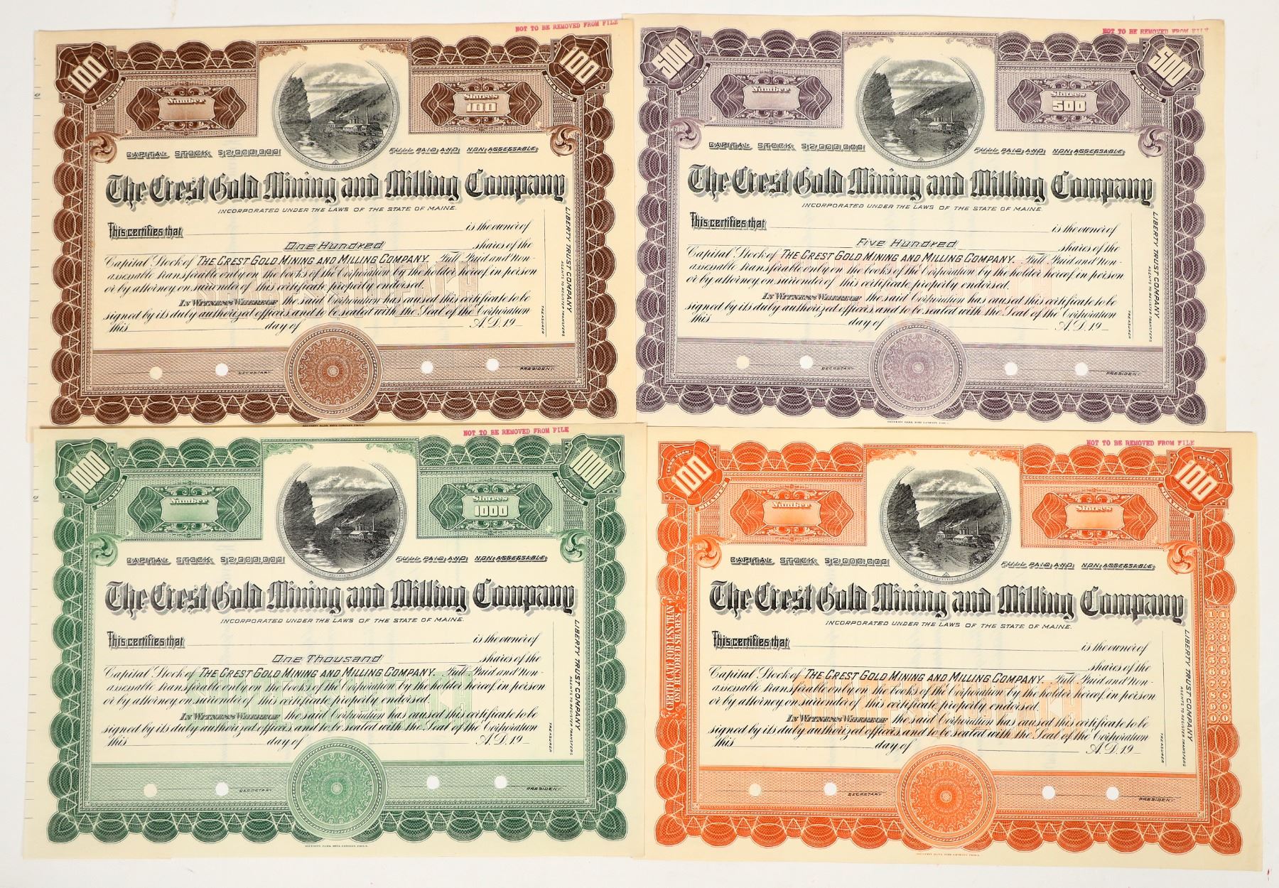 Lot of 4 different. Security Bank Note Co., Philadelphia. Mining vignette. Different border colors. The Crest mine was located at Lee, Inyo County. (See: Boston Evening Transcript_x000D_