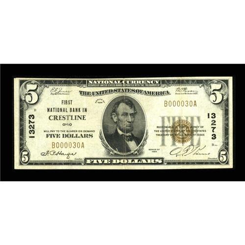 <B>Crestline, OH</B></I> - $5 1929 Ty. 1 <B>First NB</B></I> Ch. # 13273<BR>Small notes only from this bank, with rather few recent appearances despite a healthy census population. <B>Very Fine.</B></I><BR><BR><b>Shipping:</b> Coins & Currency (<a target="_blank" href="http://www.heritageauctions.com/common/shipping.php">view shipping information</a>)