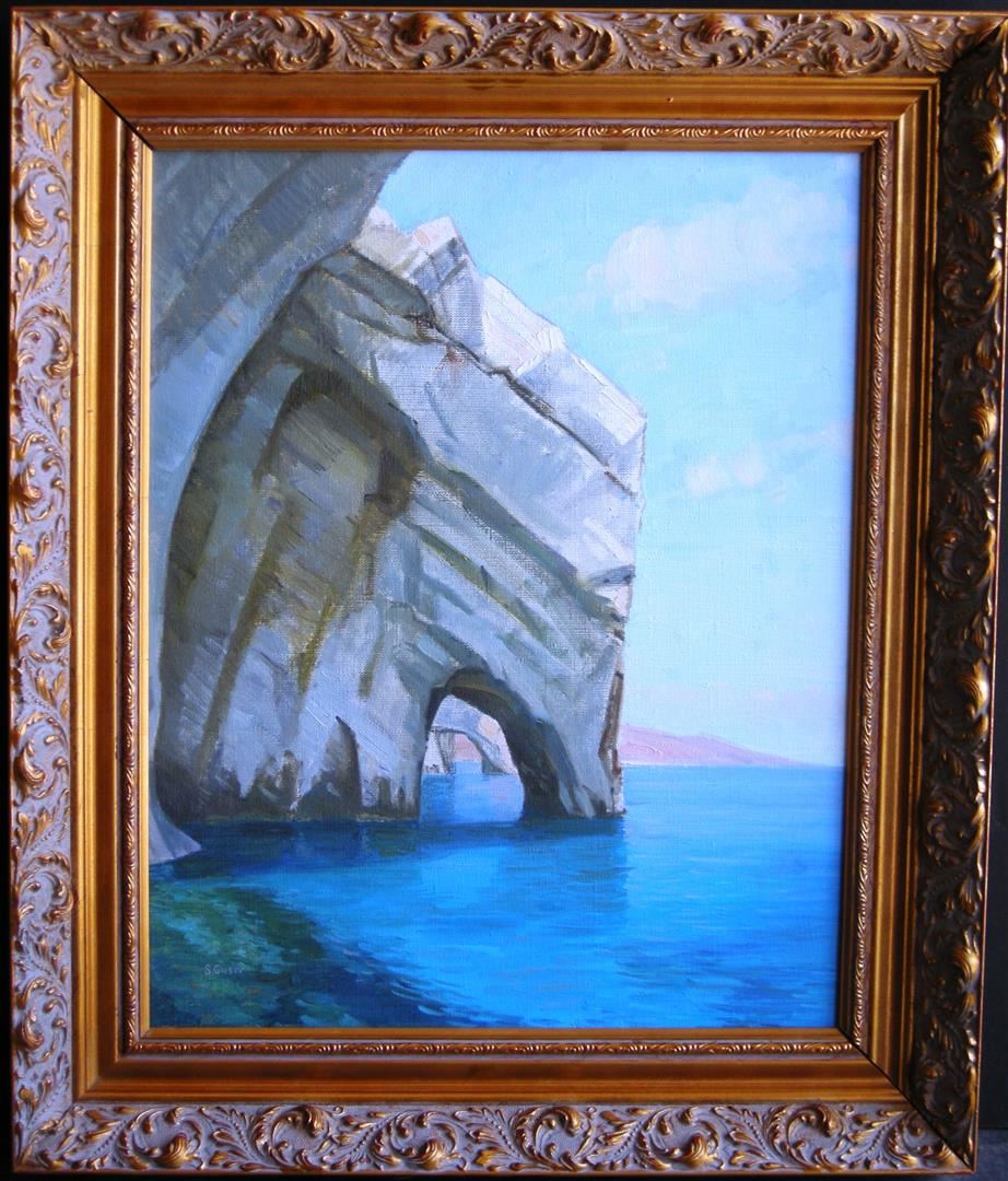 Artist Sergei Gusev characterizes the towering rock formation on the coast of Crete juts into the surrounding blue sea. The oil on canvas measures 20 x 16, framed painting measures approx. 26 x 22.