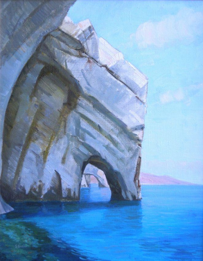 Crete by Sergei Gusev shows a rock formation is the coast of crete in a framed original oil on canvas. The size is 30" x 26".