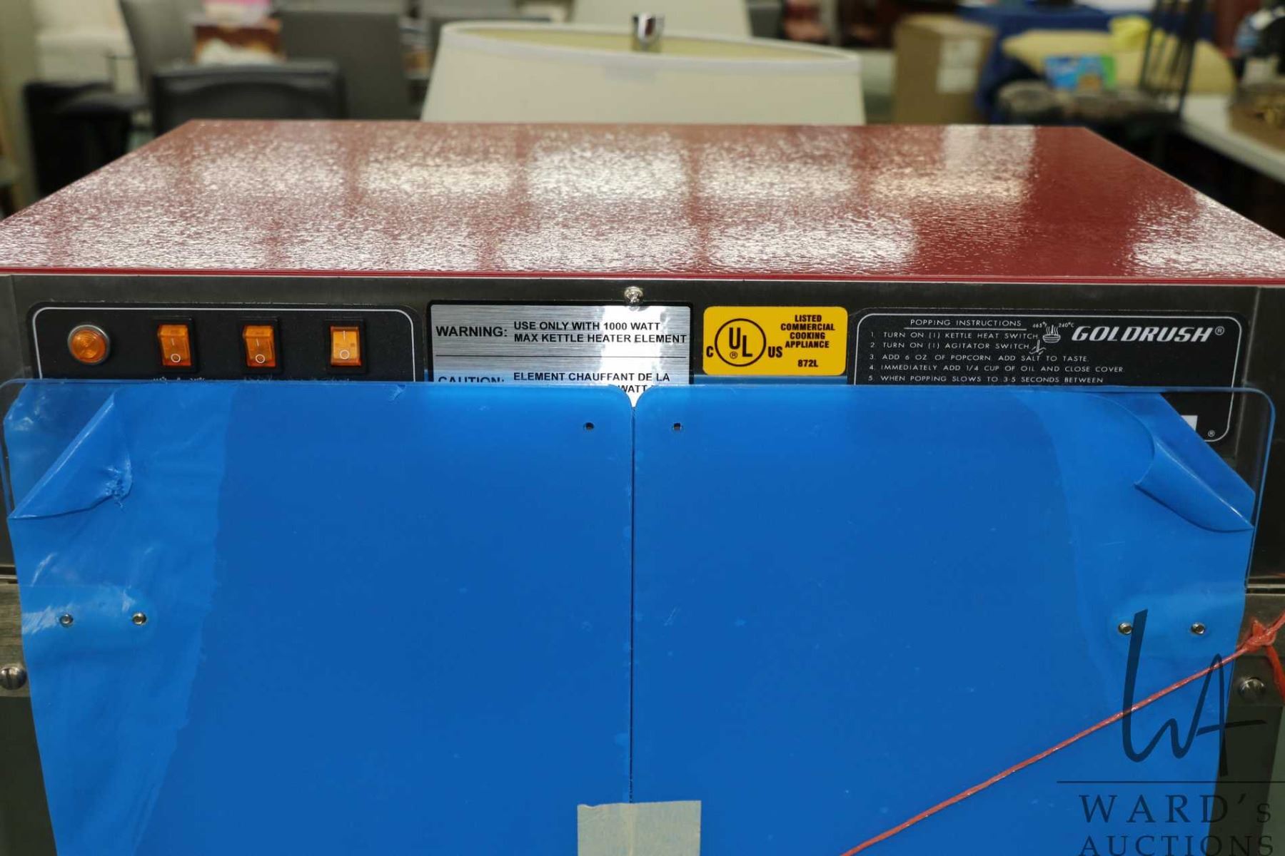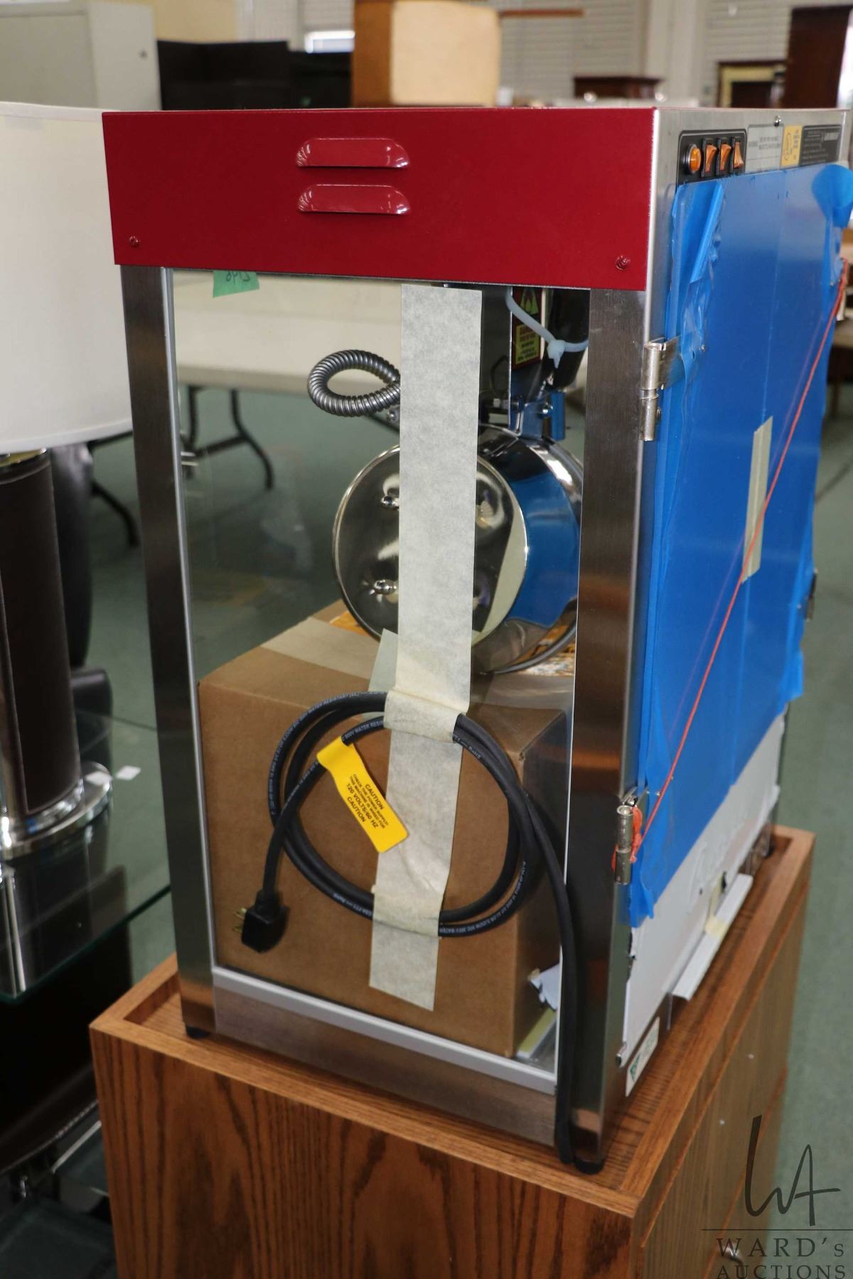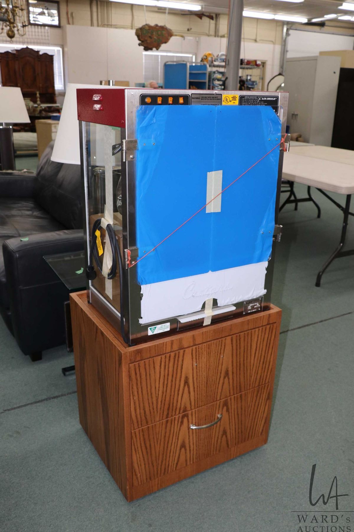 Cretors popcorn machine 27" H X 20" W X 14" D, in unused condition, sitting on 23" H shop made two drawer rolling pedestal. Note: Not available for shipping. Local pickup only