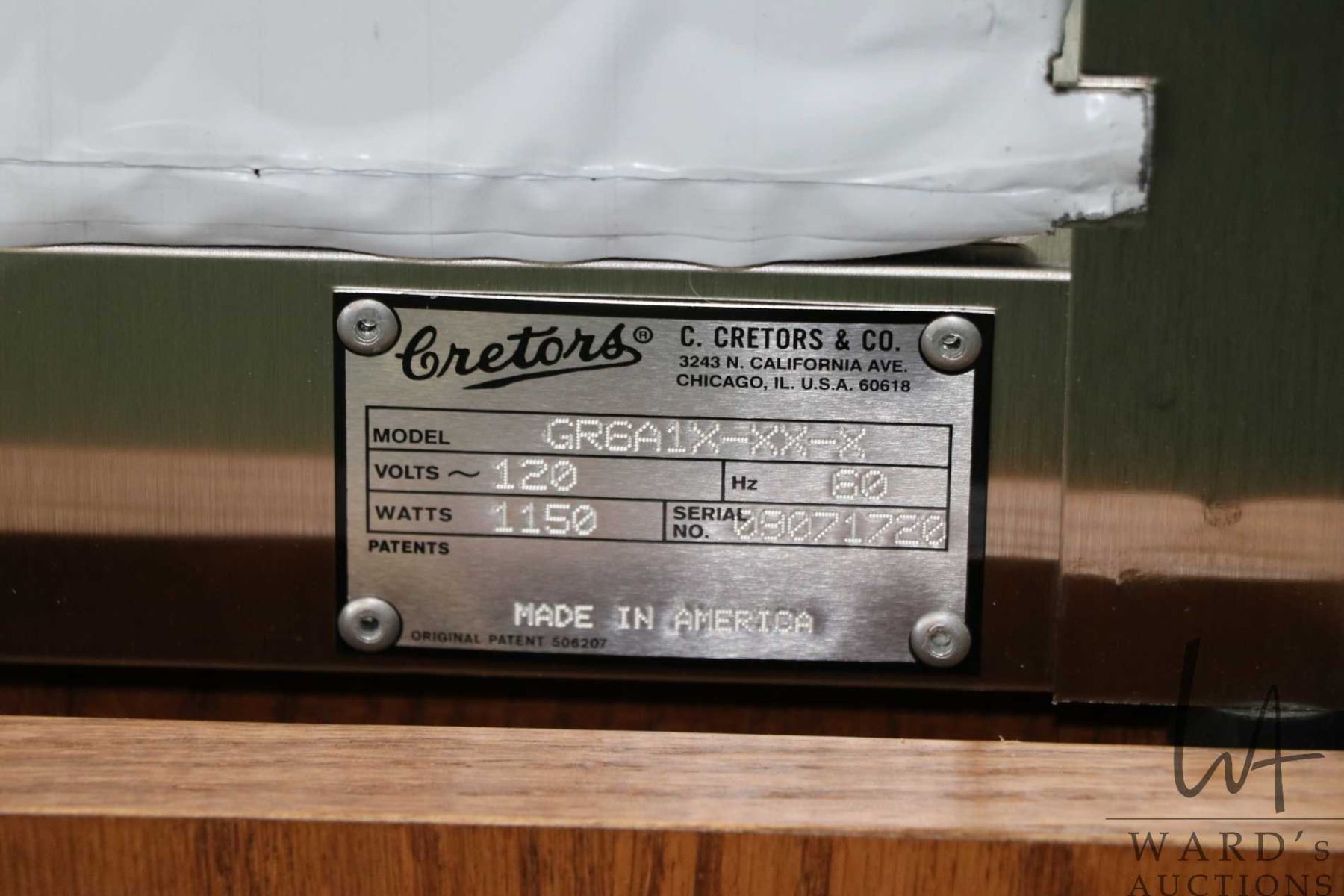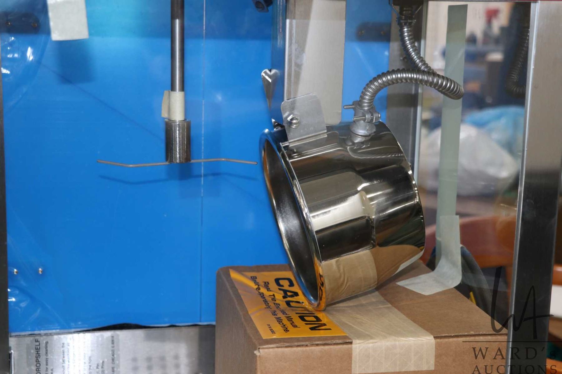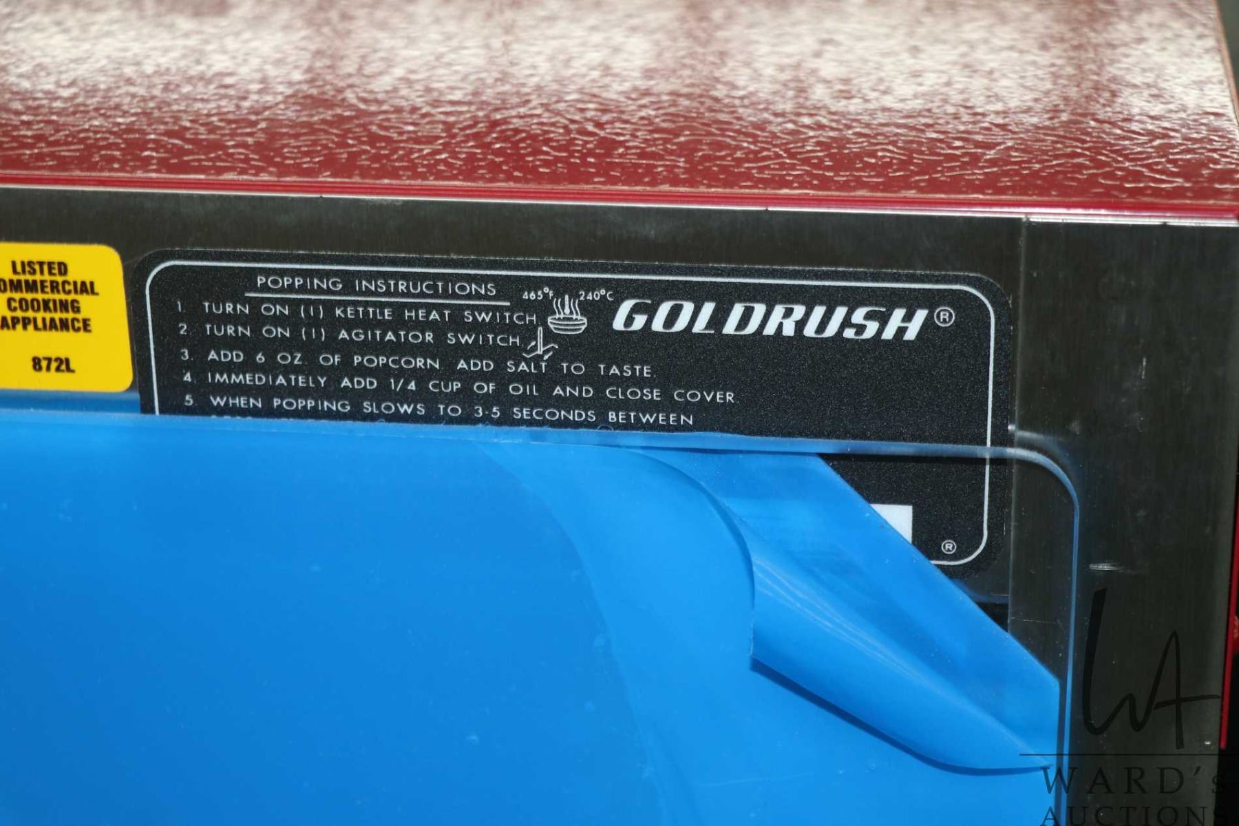 Cretors popcorn machine 27" H X 20" W X 14" D, in unused condition, sitting on 23" H shop made two drawer rolling pedestal. Note: Not available for shipping. Local pickup only