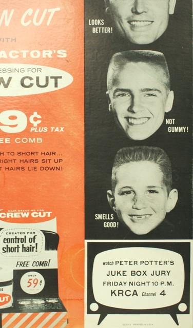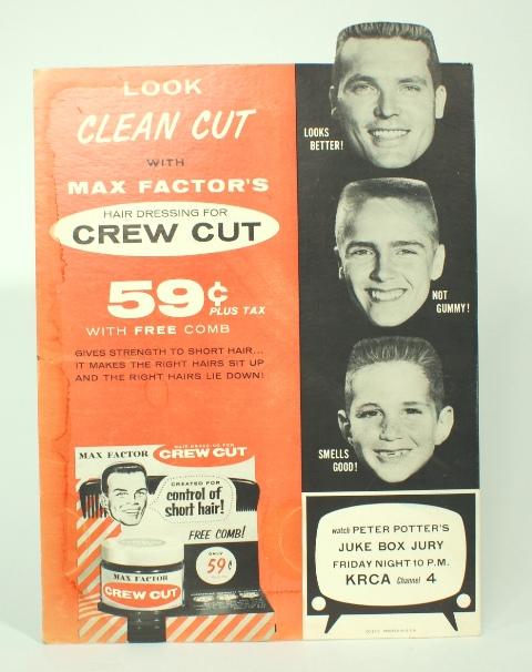 From the Max Factor Collection / Hair Dressing for Crew Cut Control Standing Cardboard Advertisement / Featuring Peter Potter's Juke Box Jury Friday Night 10 P.M. KRCA Channel 4 / { 14" H x 10" W}