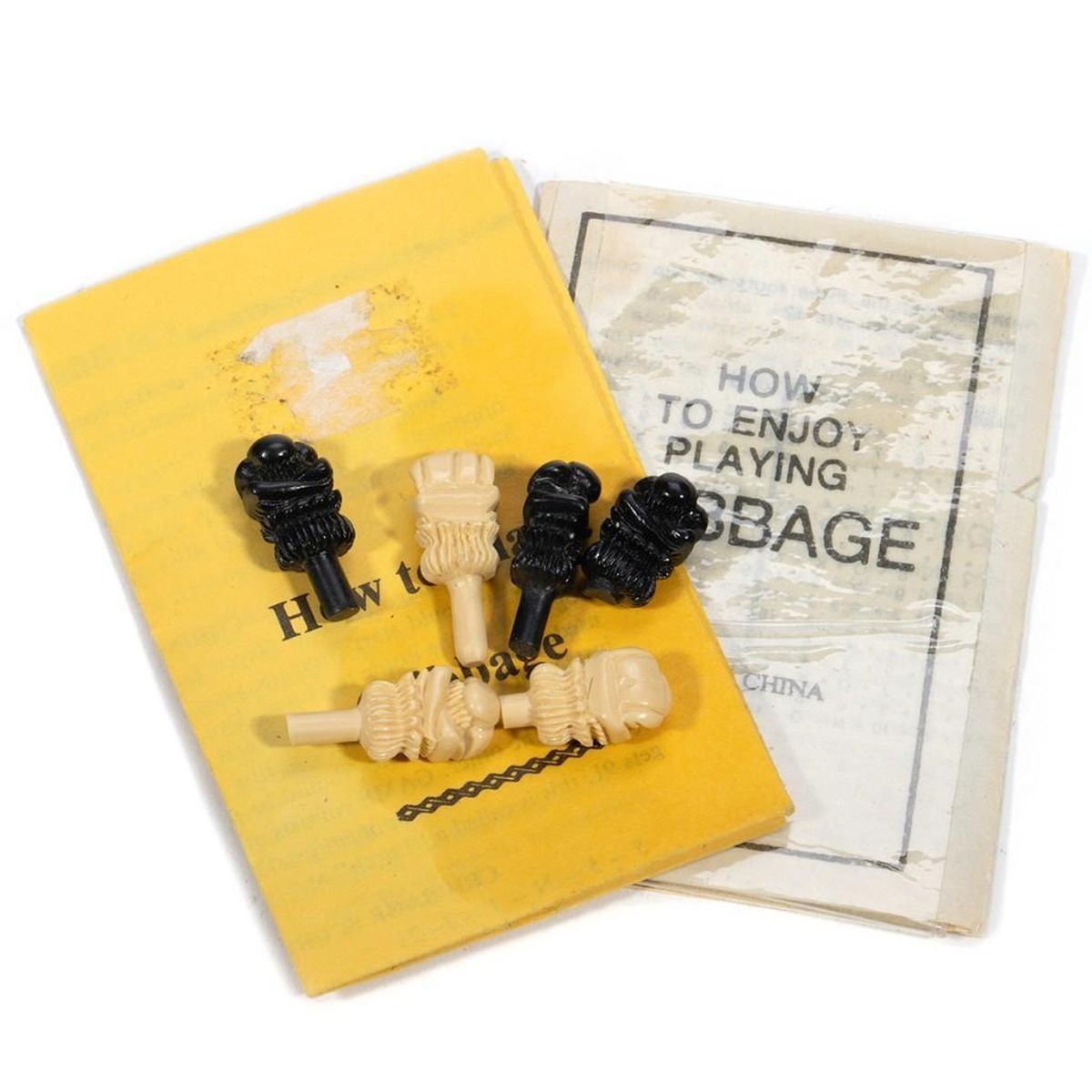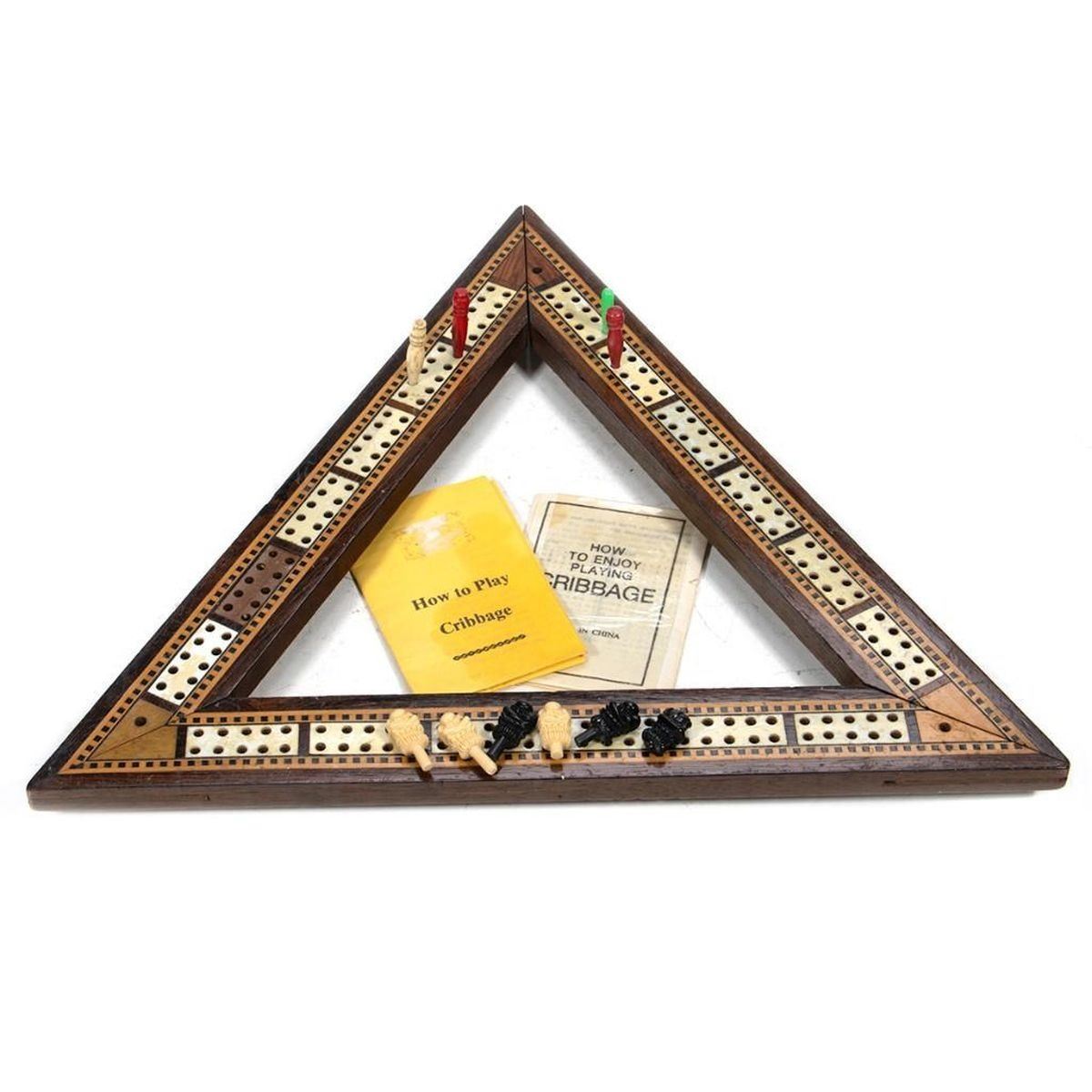 The inlaid triangular board with some playing pins. 12 1/2in. (31cm) l.