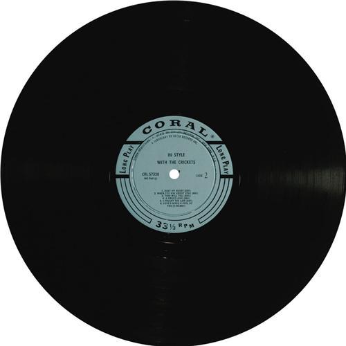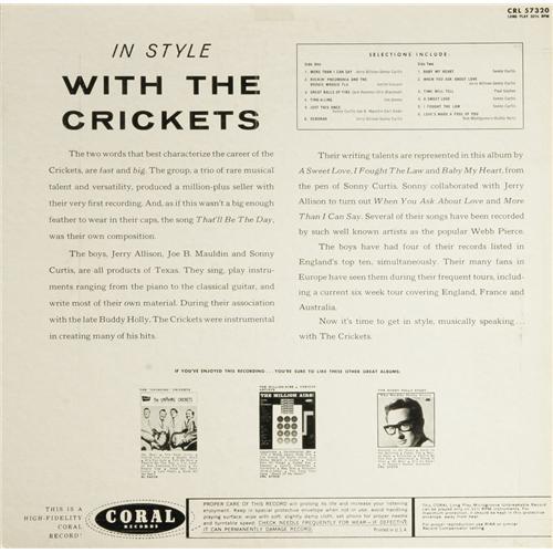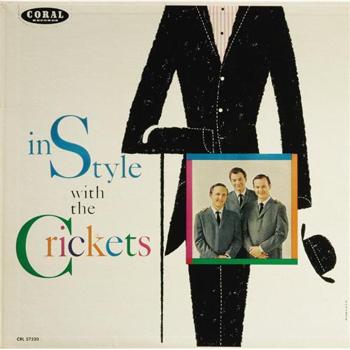 <B>"In Style With The Crickets" Blue Label Promo Mono LP Coral 57320 (1960).</B></I> Listening to this great album, you'll wonder why the group wasn't successful on their own after Buddy Holly's death. They had the sound, and two of the three (Jerry Allison and Sonny Curtis) had written or co-written many of the hits they had enjoyed with Buddy. Two great nuggets are included on this under-the-radar album: 1) "More Than I Can Say" (Allison and Curtis) -- covered in 1961 by Bobby Vee (flipside of his hit, "Stayin' In"), and by Leo Sayer, who took the tune to #2 in 1980; and 2) "I Fought the Law" (Curtis), later a big hit for the Bobby Fuller Four in 1966. The cover concept of the album is very avant-garde for the day, and done in a textured style that they had first employed on their classic (with Buddy) debut album, "The Chirping Crickets." This blue label promo copy is in stunning condition. Condition: NM 8/ MT 9. <I>From the GRT Collection</B></I>