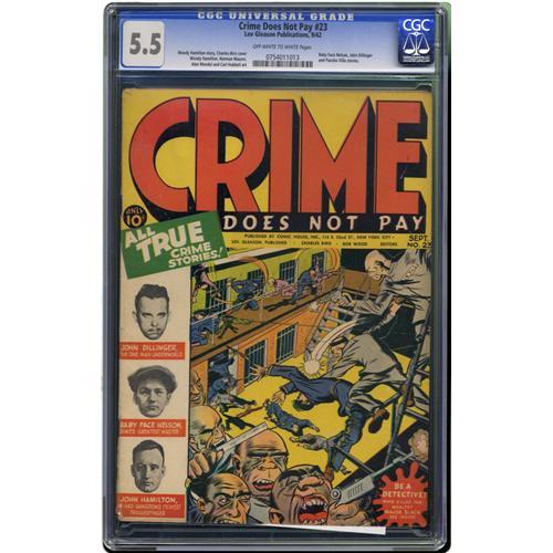 <B>Crime Does Not Pay #23 (Lev Gleason, 1942) CGC FN- 5.5 Off-white to white pages.</B></I> Overstreet calls this book "scarce" and ranks it at #3 on the list of the most valuable crime comics. No wonder it's sought after, as it's just the second issue of the title that started an entire genre. Overstreet 2006 FN 6.0 value = $405. CGC census 2/06: 1 in 5.5, 5 higher. <I>From the Collection of Harold Curtis.</B></I>
