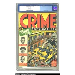 Crime Does Not Pay #23 (Lev Gleason, 1942) CGC VF- 7.5 Off-white pages. This is the second of 57 consecutive covers Charles Biro drew for the title, considered the first crime comic. Not too many copies of this issue are to be found. Gerber rates the issue "uncommon," while Overstreet goes so far as to call it "scarce." So far, just two copies have scored higher grades from CGC than this copy, which boasts a cover that would be at home with a higher grade. Overstreet 2002 VF 8.0 value = $795. Important notice: We expect to be auctioning lots at the rate of 200-250 per hour. Sometimes eBay Premier live bid software cannot keep up with that pace, so we strongly recommend that you place a realistic proxy bid now as insurance to avoid disappointment. Also please note that all Heritage/CAA lots purchased through eBay Premier carry a 20% Buyer's Premium. Please make sure you read the Terms and Conditions.