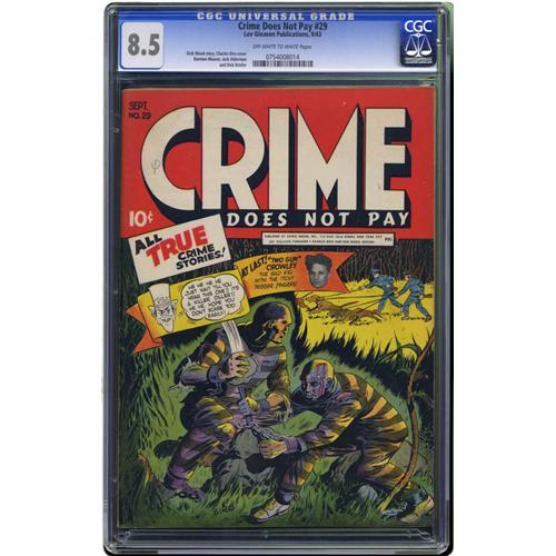 <B>Crime Does Not Pay #29 (Lev Gleason, 1943) CGC VF+ 8.5 Off-white to white pages.</B></I> This is the only high-grade copy of this issue to be certified by CGC as of this writing. <B>Crime Does Not Pay</B></I> was a huge seller in its day, but everyone and his cellmate would thumb through their copies, creasing 'em and smudging 'em while engrossed in Charles Biro's thrill-packed stories. We heartily recommend you give them a read too... but get a reading copy for that, and grab this one strictly for bragging rights! Overstreet 2006 VF 8.0 value = $381; VF/NM 9.0 value = $603. CGC census 1/06: 1 in 8.5, none higher. <I>From the Collection of Harold Curtis.</B></I>