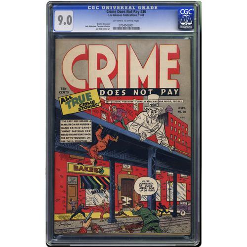 <B>Crime Does Not Pay #30 (Lev Gleason, 1943) CGC VF/NM 9.0 Off-white to white pages.</B></I> No copy of this early issue has been graded higher by CGC to date. Editor Charles Biro drew the cover; interior artists include Dick Briefer. Overstreet 2006 VF/NM 9.0 value = $603; NM- 9.2 value = $825. CGC census 2/06: 1 in 9.0, none higher. <I>From the Collection of Harold Curtis.</B></I>