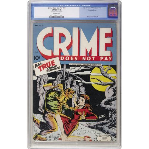 <B>Crime Does Not Pay #33 Double Cover (Lev Gleason, 1944) CGC VF/NM 9.0 Off-white pages.</B></I> The most famous and collectible cover of this series' run makes #33 a memorable issue indeed. Charles Biro, no stranger to hard-hitting stuff, drew the terrifying scene. CGC notes, ""1st cover 7.5, interior cover 9.0."" Overstreet 2006 VF/NM 9.0 value = $430; NM- 9.2 value = $585. CGC census 3/07: 4 in 9.0, none higher.<BR><BR><b>Shipping:</b> Comics - Slabbed (certified) (<a target=""_blank"" href=""http://www.heritageauctions.com/common/shipping.php"">view shipping information</a>)