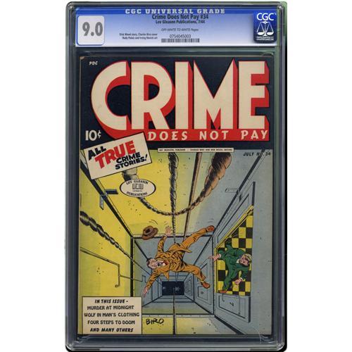 <B>Crime Does Not Pay #34 (Lev Gleason, 1944) CGC VF/NM 9.0 Off-white to white pages.</B></I> We can't emphasize enough how underrated Charles Biro's covers for Lev Gleason are! This one's among his most inventive. Rudy Palais and Irv Novick, no slouches in their own right, contributed interior art to the issue. Overstreet 2006 VF/NM 9.0 value = $370; NM- 9.2 value = $500. CGC census 2/06: 2 in 9.0, 1 higher. <I>From the Collection of Harold Curtis.</B></I>
