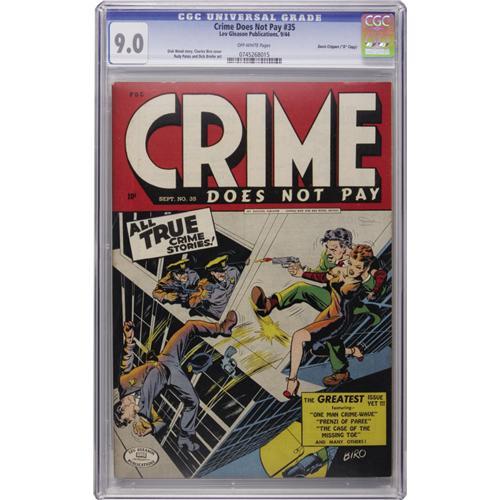 <B>Crime Does Not Pay #35 Davis Crippen ("D" Copy) pedigree (Lev Gleason, 1944) CGC VF/NM 9.0 Off-white pages.</B></I> Look closely at this Charles Biro cover to see all the wild stuff going on, and we're not even talking about the "headlights!" Overstreet 2006 VF/NM 9.0 value = $370; NM- 9.2 value = $500. CGC census 9/06: 2 in 9.0, 2 higher. <I>From the Crippen Collection</B></I>.<BR><BR><b>Shipping:</b> Slabbed Comic (<a target="_blank" href="http://www.heritageauctions.com/common/shipping.php">view shipping information</a>)