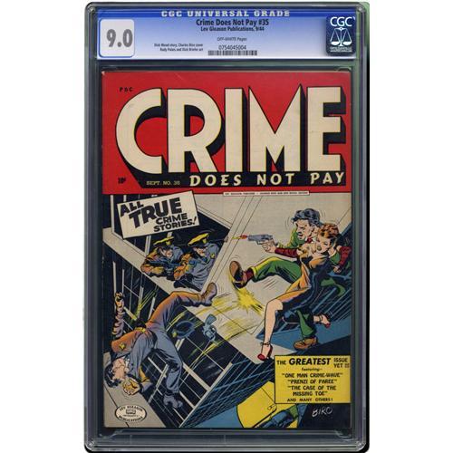 <B>Crime Does Not Pay #35 (Lev Gleason, 1944) CGC VF/NM 9.0 Off-white pages.</B></I> This title was one of the bestselling series in comics, and no wonder: it had exciting Charles Biro covers drawing readers in, and unlike many comics of the day, these had stories that lived up to the promise of the cover. Rudy Palais and Dick Briefer contributed interior art to this issue. Overstreet 2006 VF/NM 9.0 value = $370; NM- 9.2 value = $500. CGC census 2/06: 1 in 9.0, 2 higher. <I>From the Collection of Harold Curtis.</B></I>
